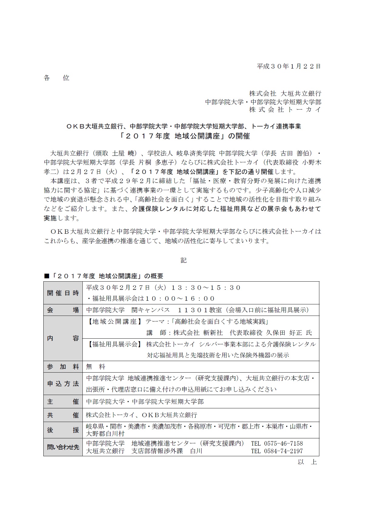 OKB大垣共立銀行、中部学院大学・中部学院大学短期大学部、トーカイ連携事業「2017年度 地域公開講座」の開催