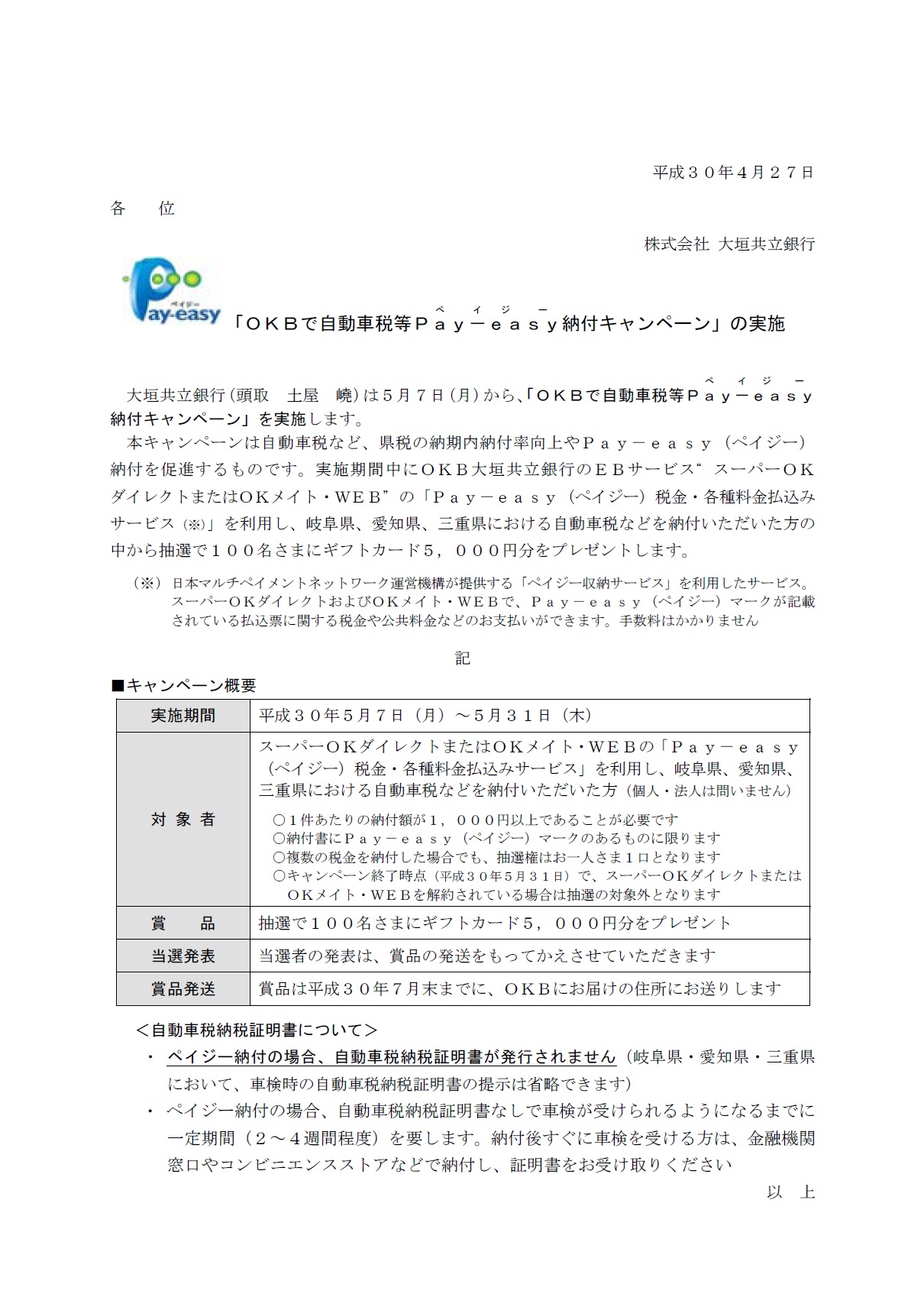 「OKBで自動車税等Pay‐easy納付キャンペーン」の実施