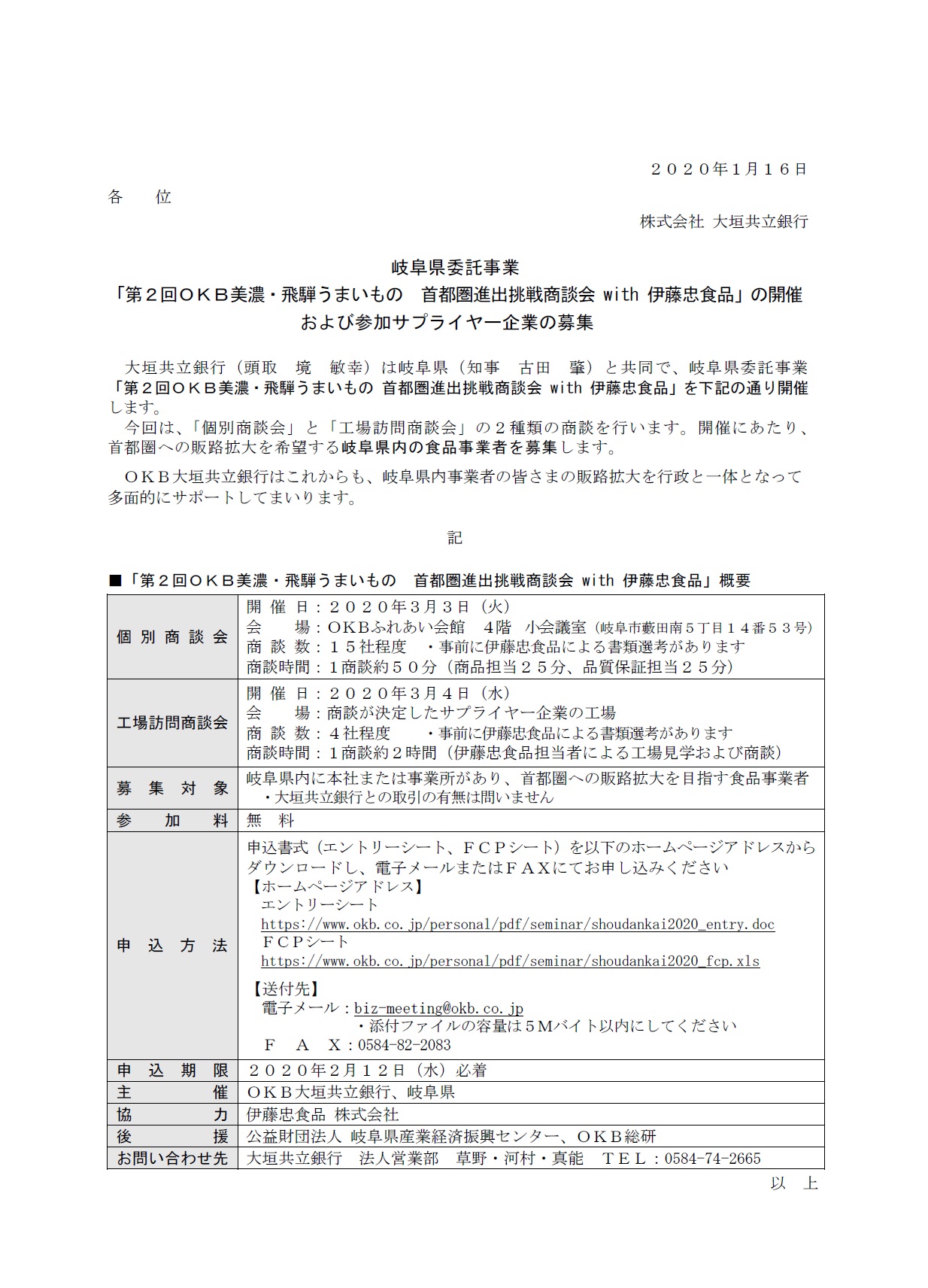岐阜県委託事業「第2回OKB美濃・飛騨うまいもの 首都圏進出挑戦商談会 with 伊藤忠食品」の開催および参加サプライヤー企業の募集