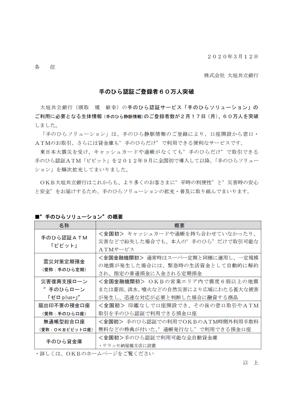 手のひら認証ご登録者60万人突破