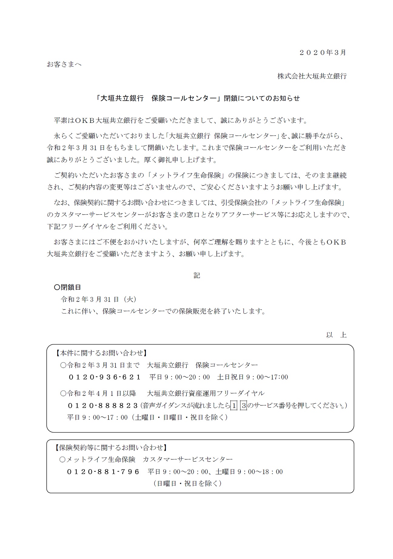「大垣共立銀行 保険コールセンター」閉鎖についてのお知らせ
