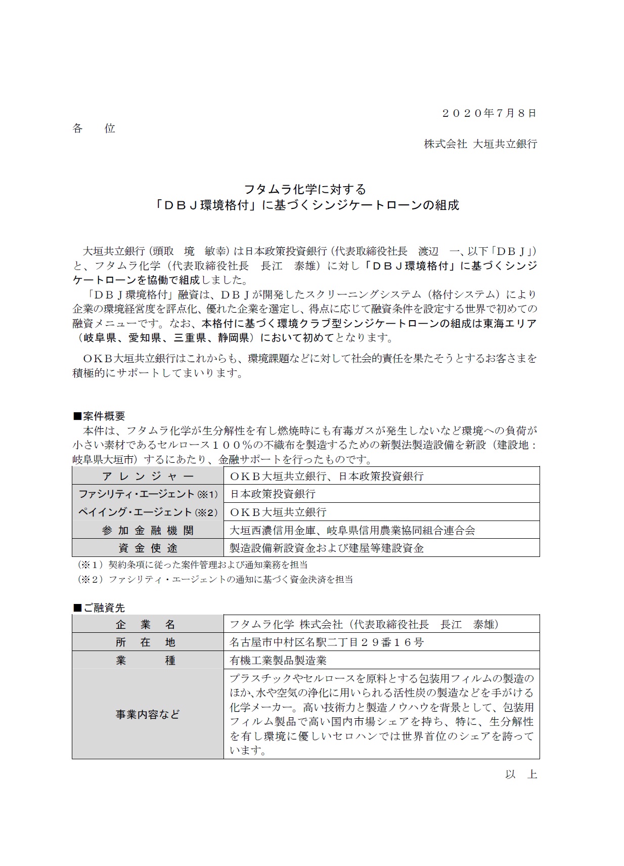 フタムラ化学に対する「DBJ環境格付」に基づくシンジケートローンの組成