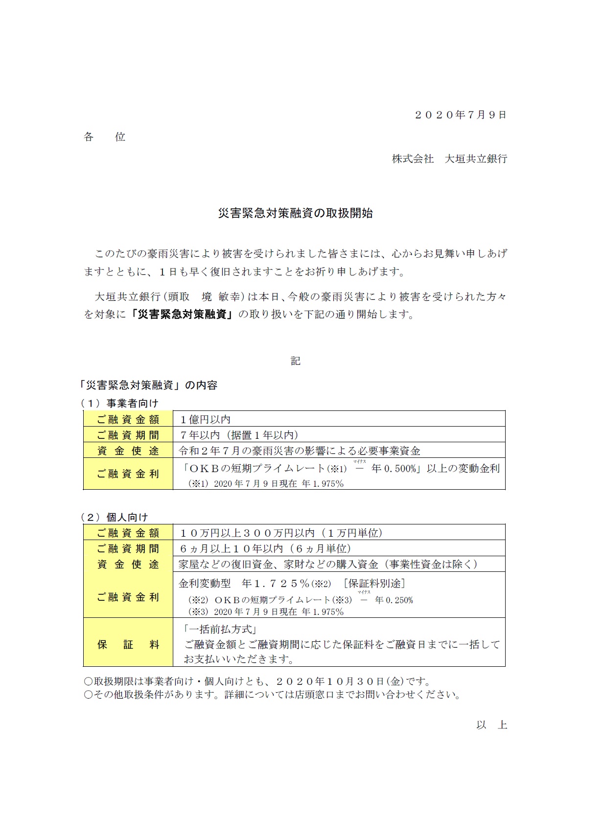 災害緊急対策融資の取扱開始