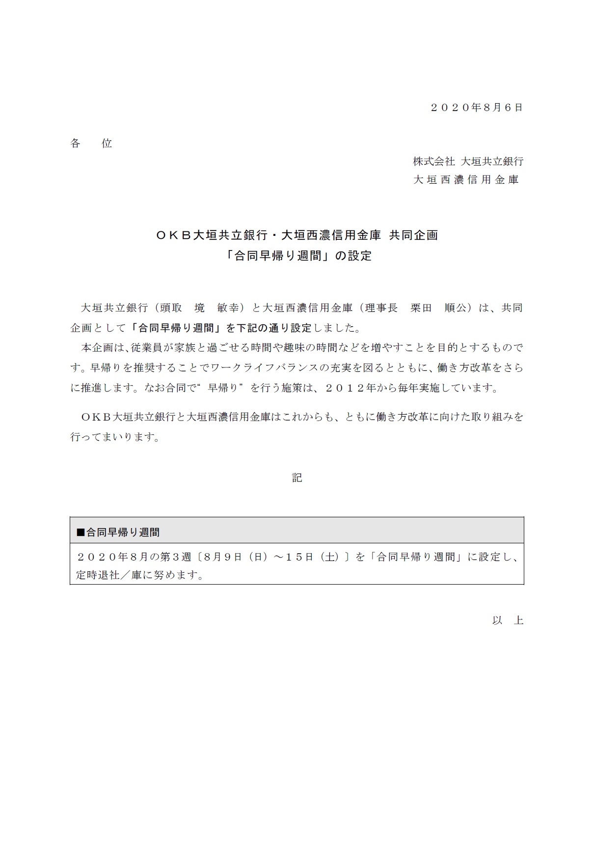 OKB大垣共立銀行・大垣西濃信用金庫 共同企画「合同早帰り週間」の設定