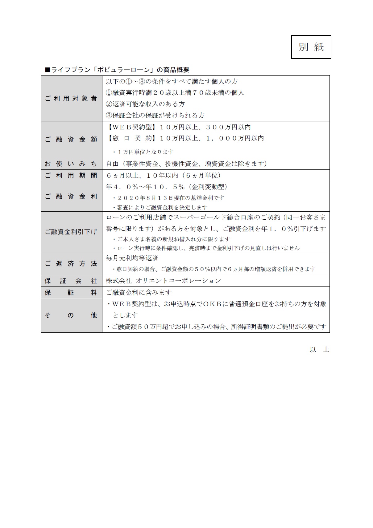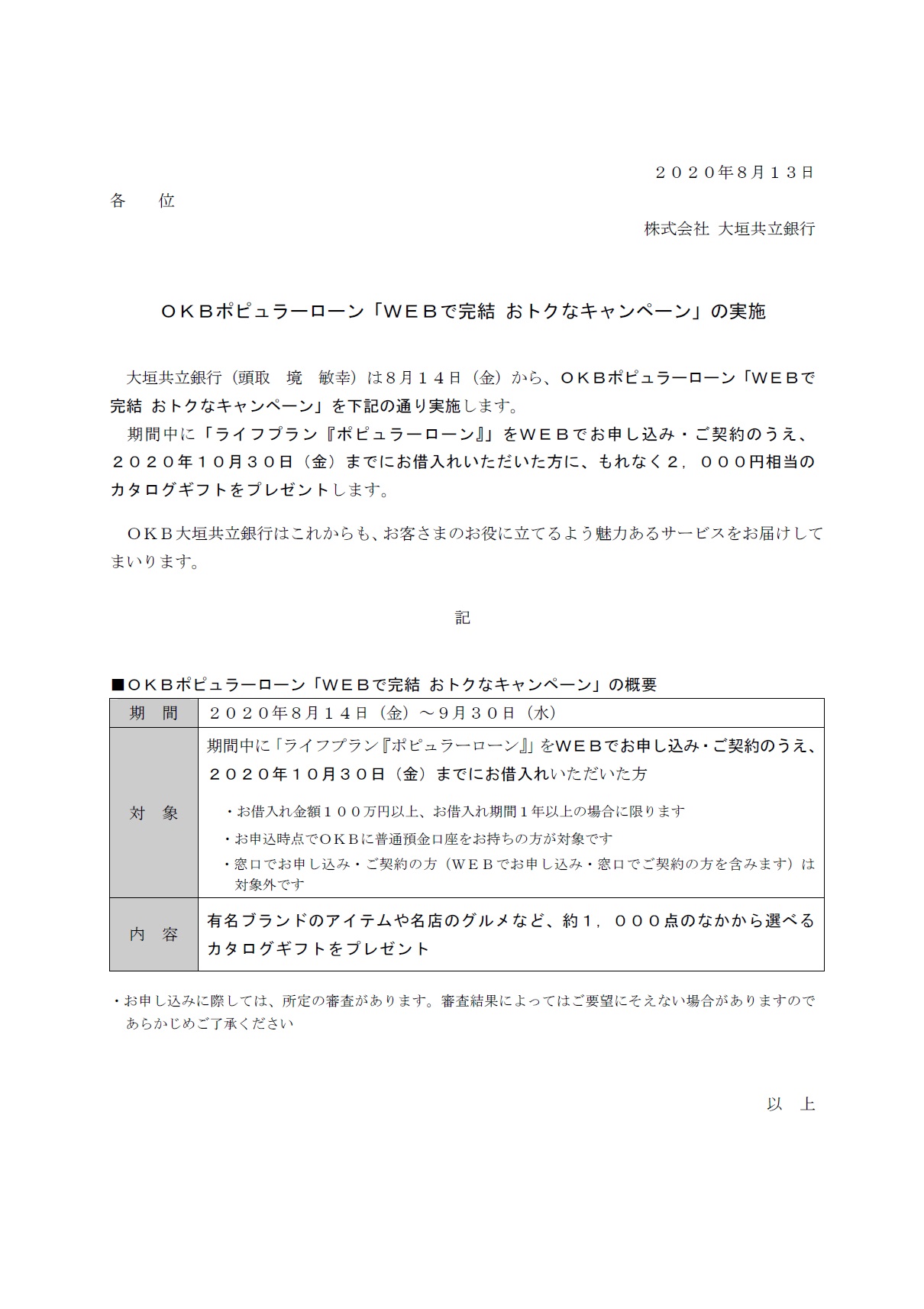 OKBポピュラーローン「WEBで完結 おトクなキャンペーン」の実施