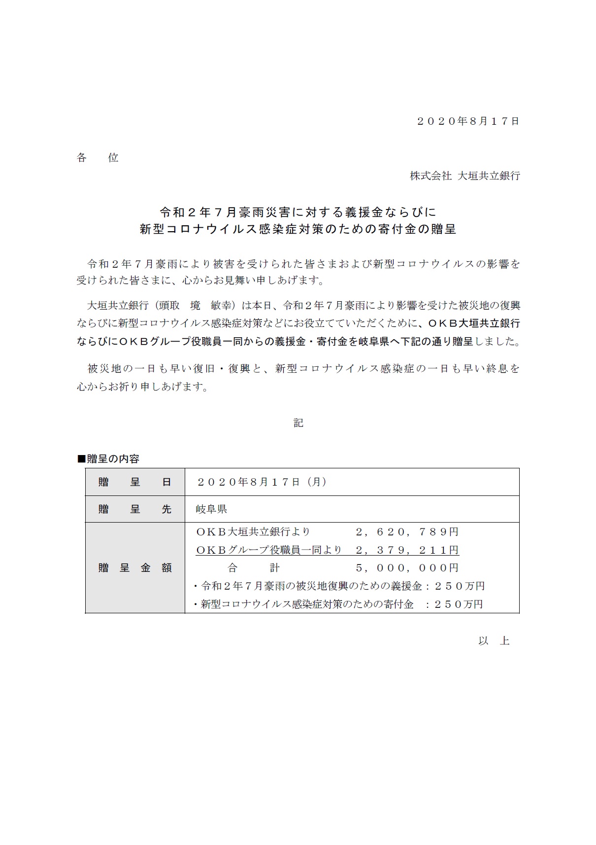 令和2年7月豪雨災害に対する義援金ならびに新型コロナウイルス感染症対策のための寄付金の贈呈