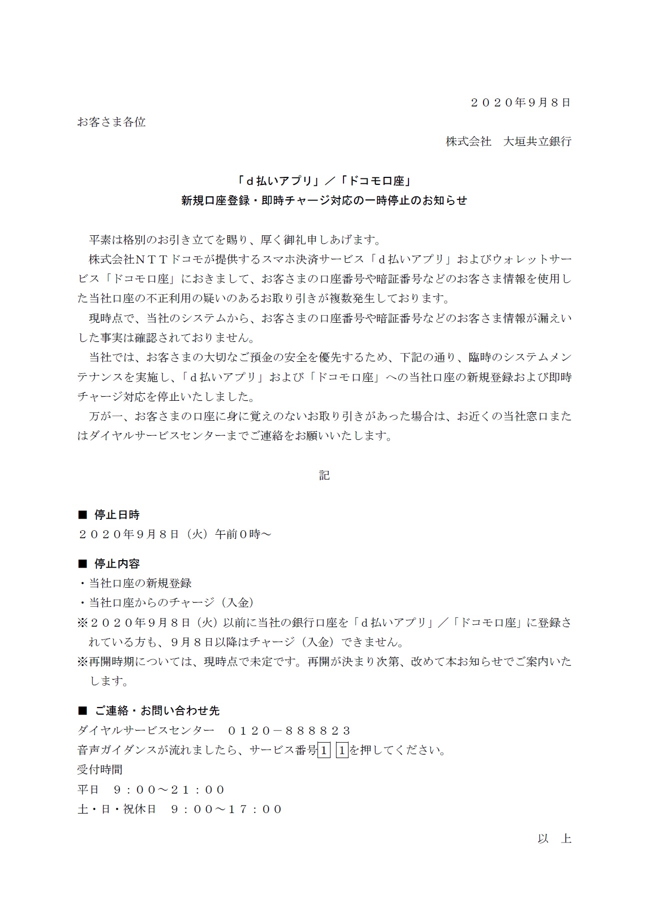 「d払いアプリ」 /「ドコモ口座」新規口座登録・即時チャージ対応の一時停止のお知らせ