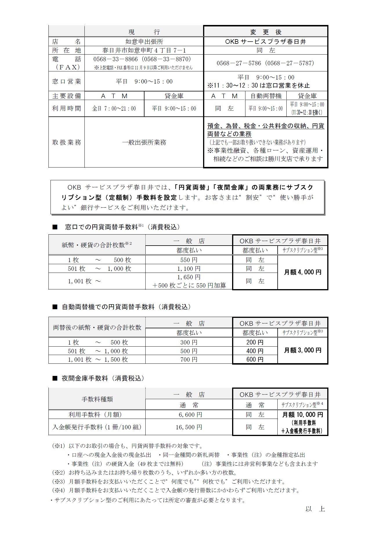 春日井エリア店舗のネットワーク再編に伴う「営業形態の変更」およびOKBサービスプラザ春日井における「サブスクリプション型手数料」について