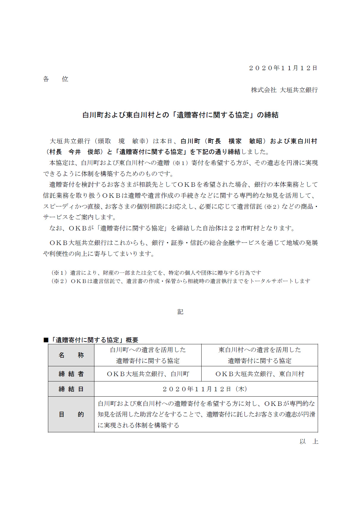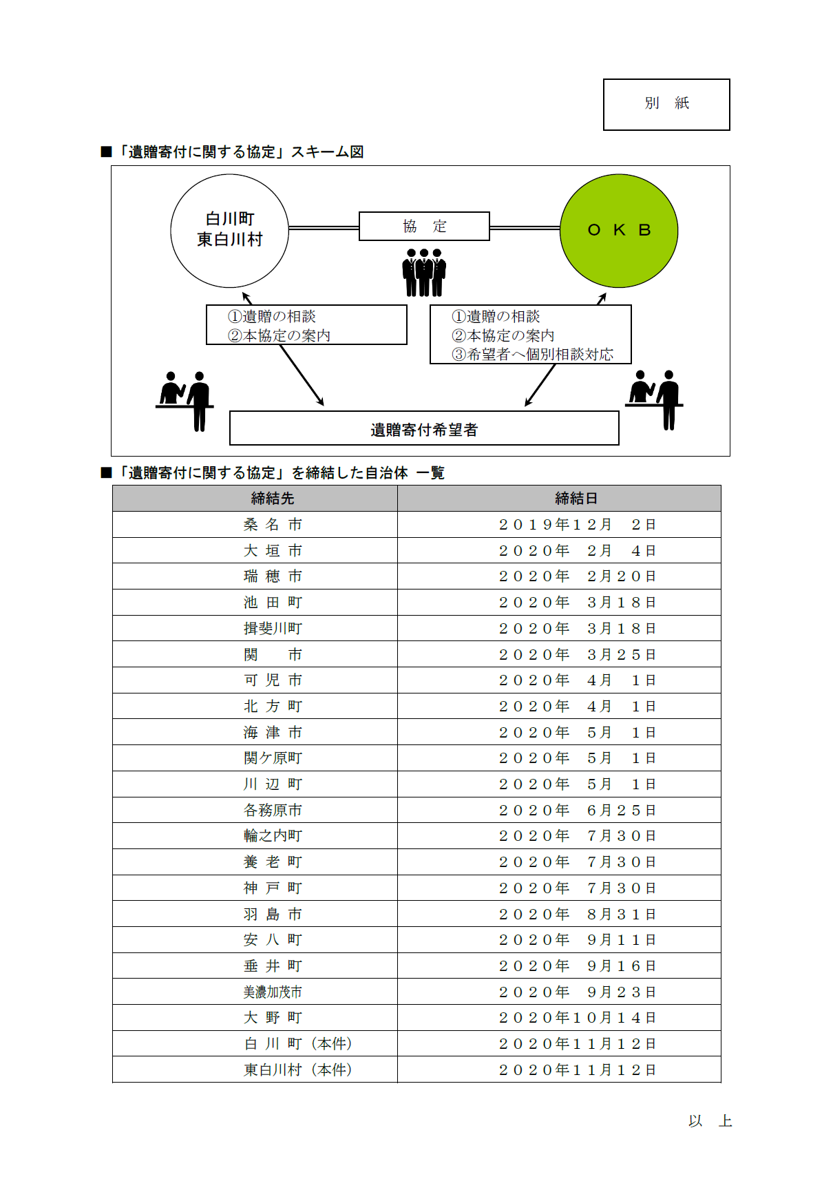 白川町および東白川村との「遺贈寄付に関する協定」の締結
