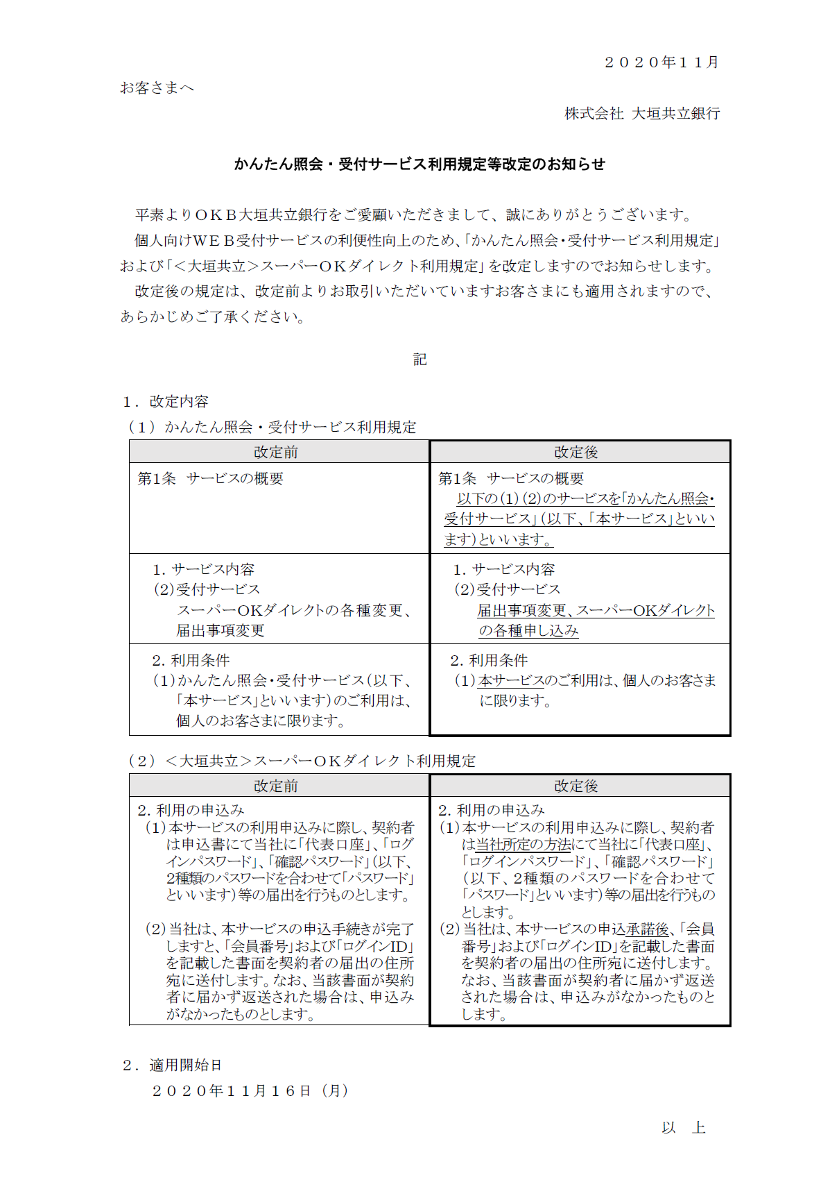 かんたん照会・受付サービス利用規定等改定のお知らせ