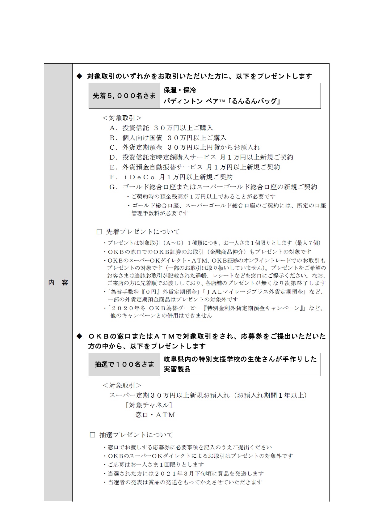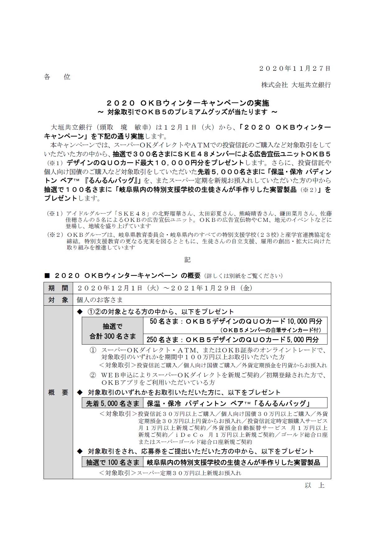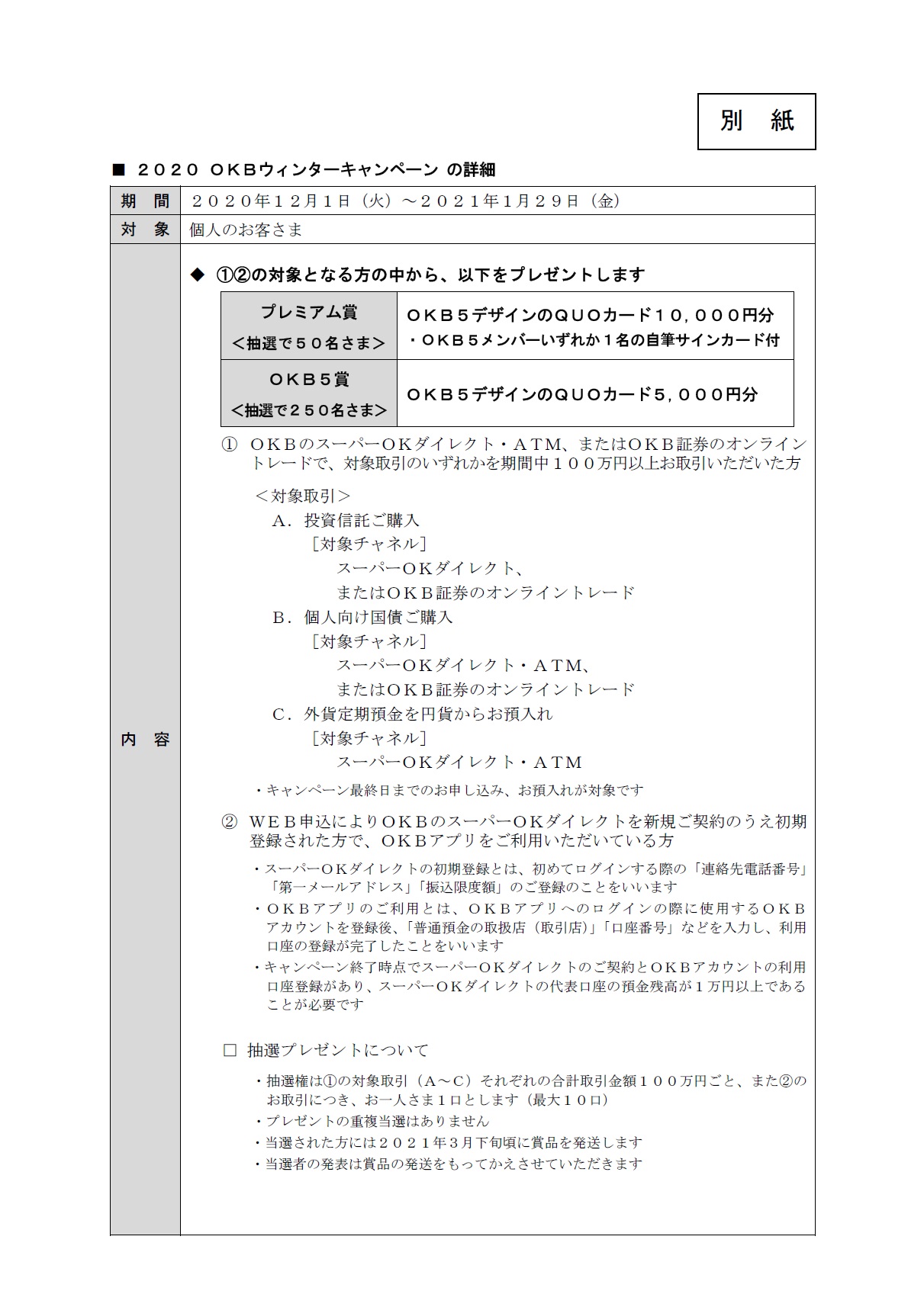 2020 OKBウィンターキャンペーンの実施~対象取引でOKB5のプレミアムグッズが当たります~