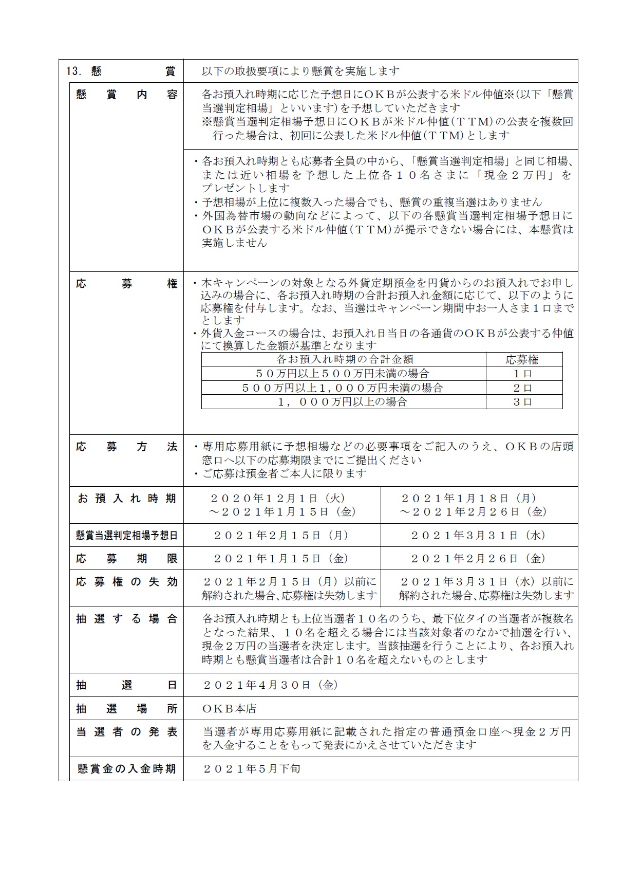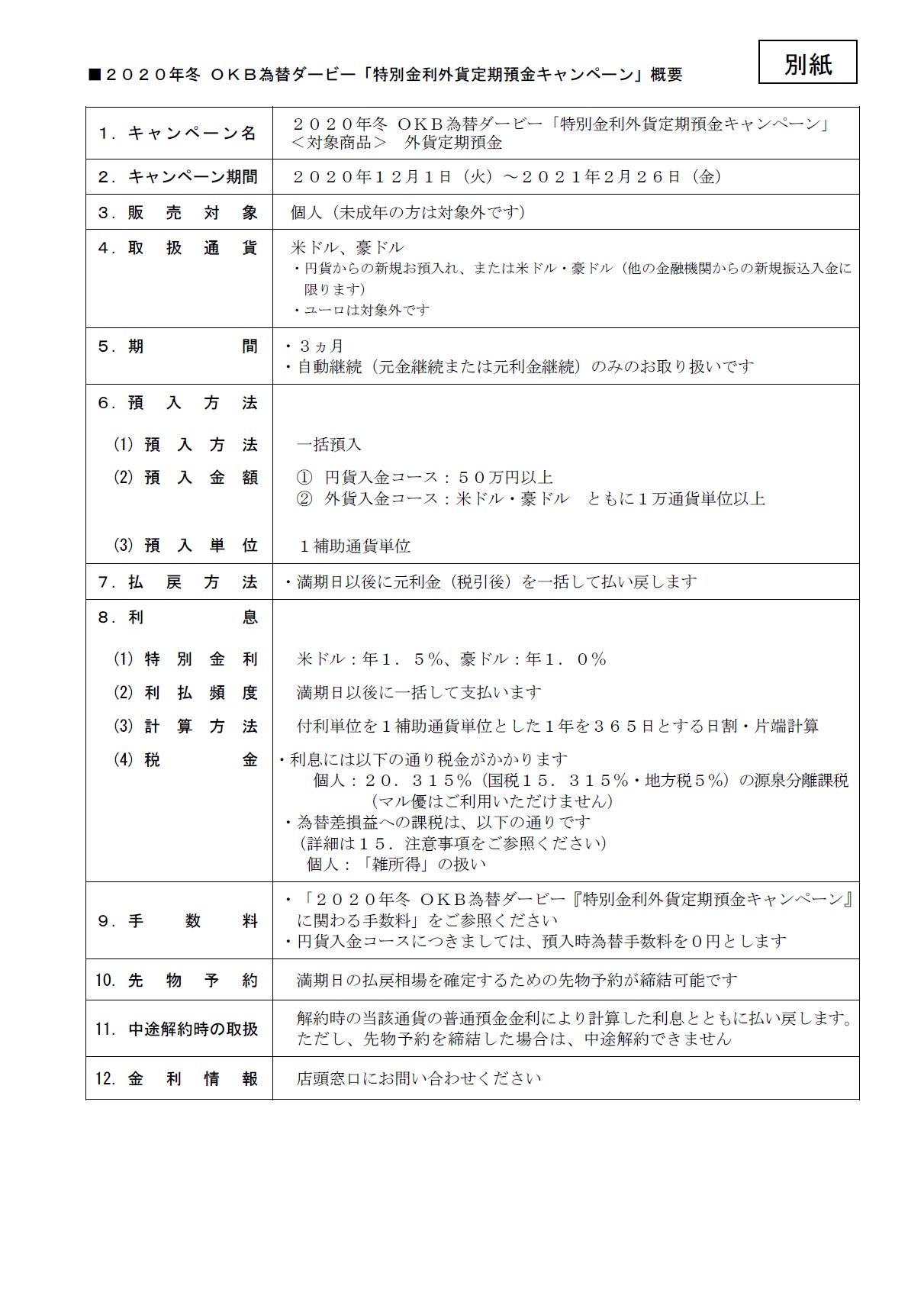 2020年冬 OKB為替ダービー「特別金利外貨定期預金キャンペーン」の実施