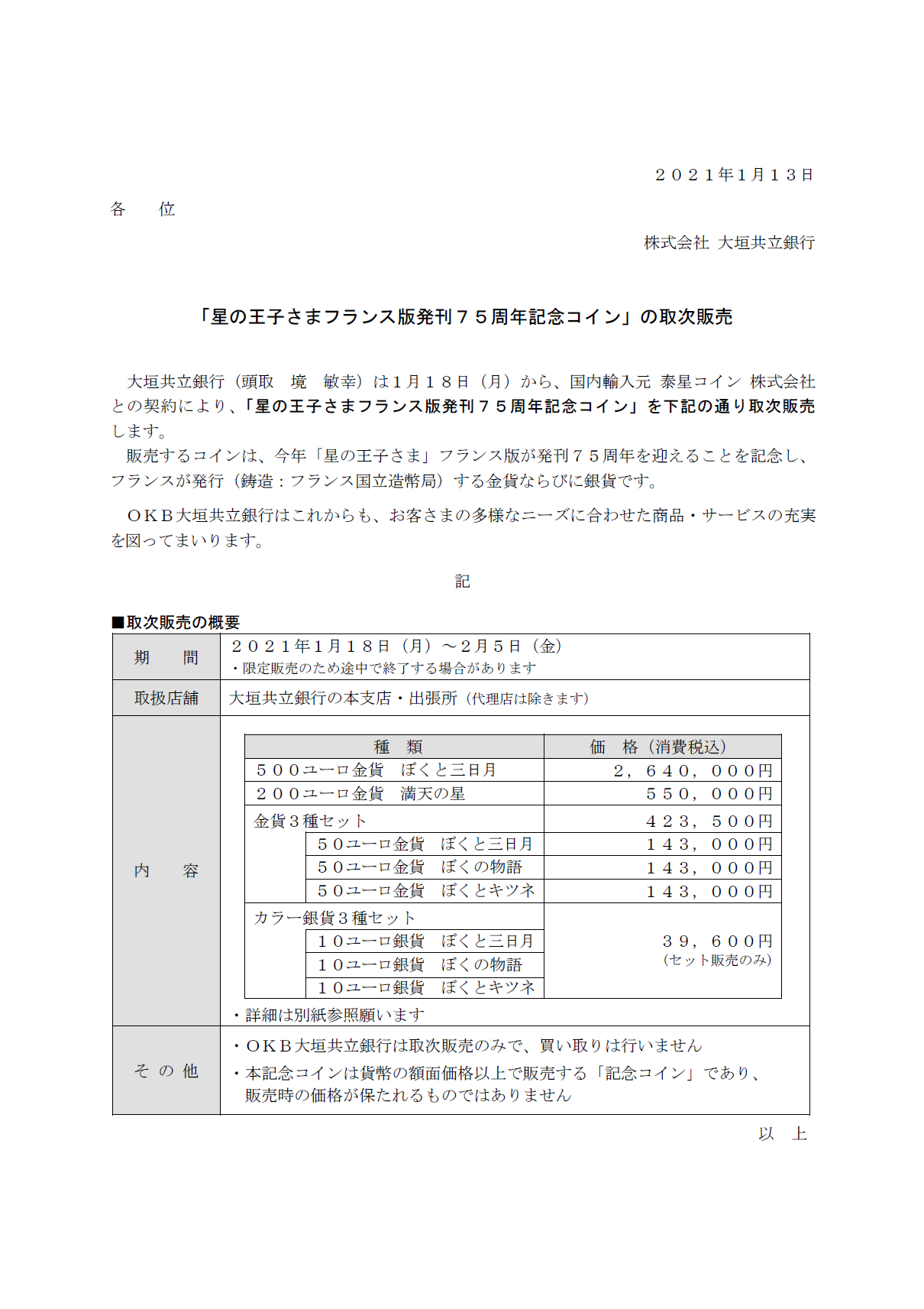 「星の王子さまフランス版発刊75周年記念コイン」の取次販売
