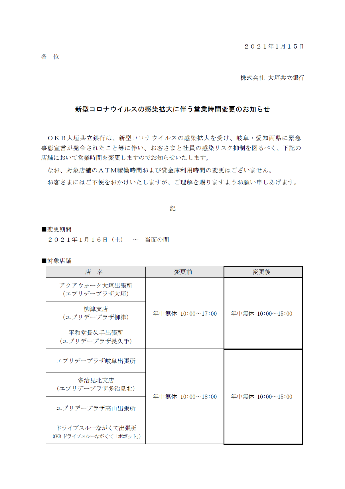 新型コロナウイルスの感染拡大に伴う営業時間変更のお知らせ