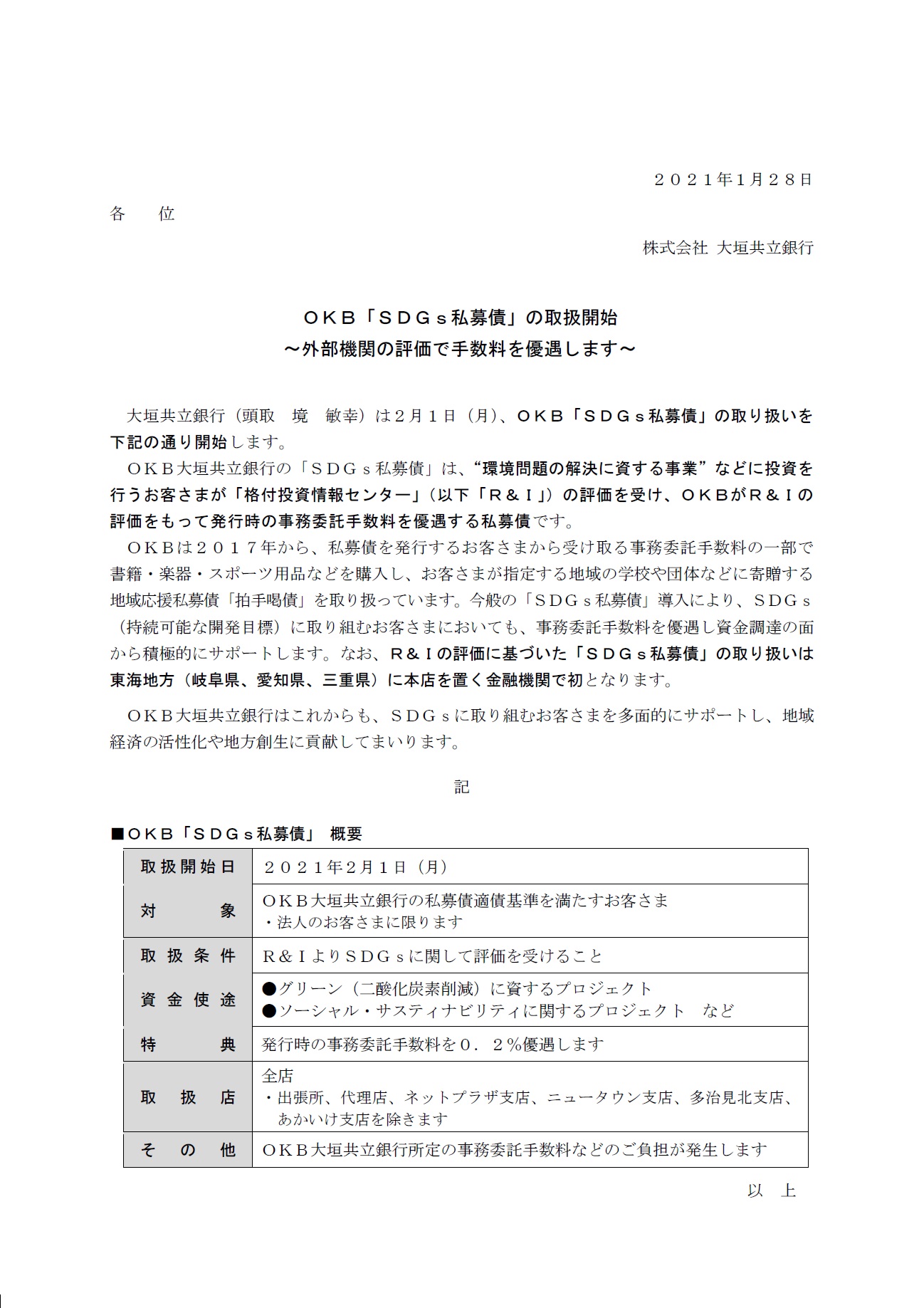 OKB「SDGs私募債」の取扱開始~外部機関の評価で手数料を優遇します~