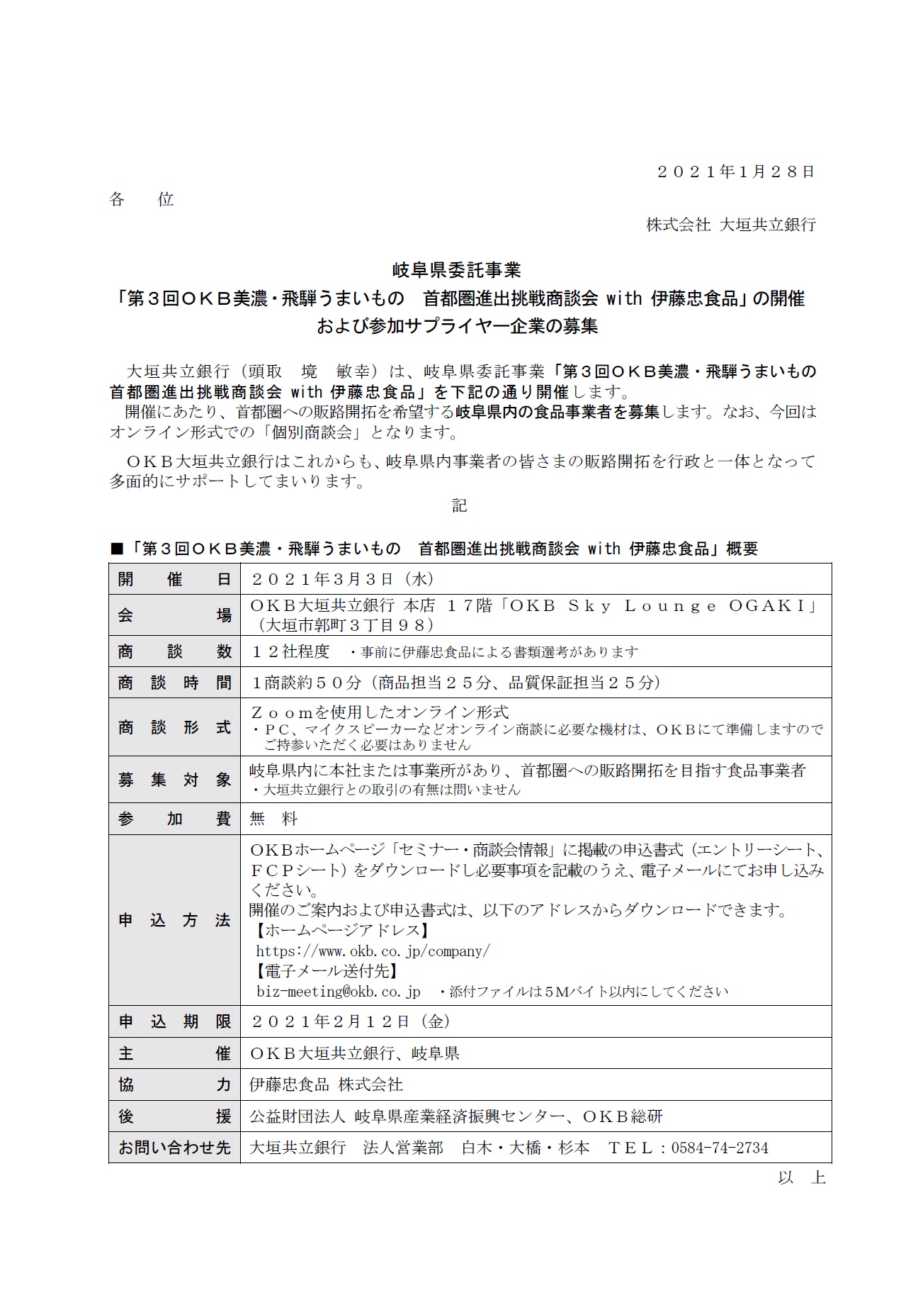 岐阜県委託事業「第3回OKB美濃・飛騨うまいもの 首都圏進出挑戦商談会 with 伊藤忠食品」の開催および参加サプライヤー企業の募集