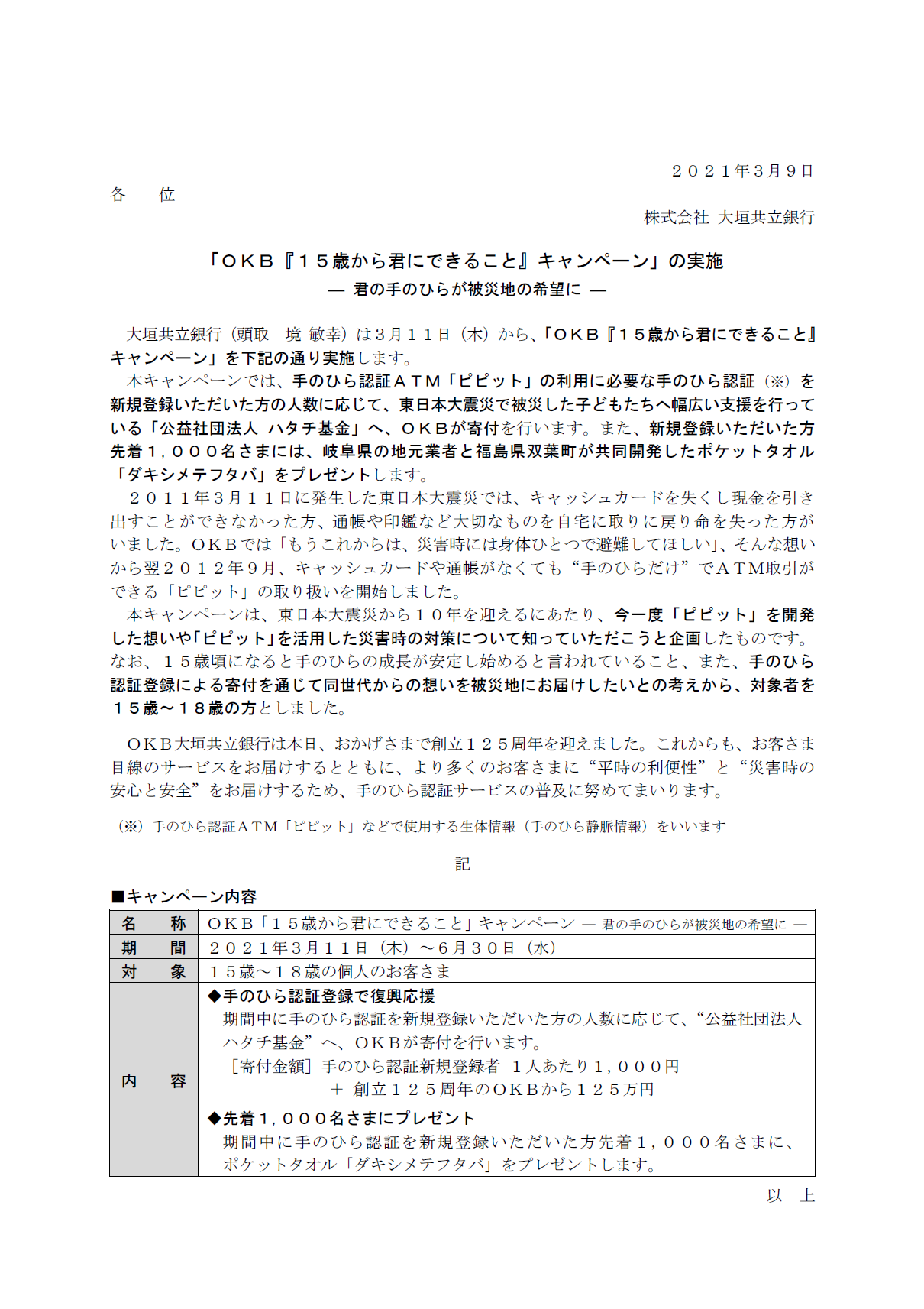 「OKB『15歳から君にできること』キャンペーン」の実施 ― 君の手のひらが被災地の希望に ―