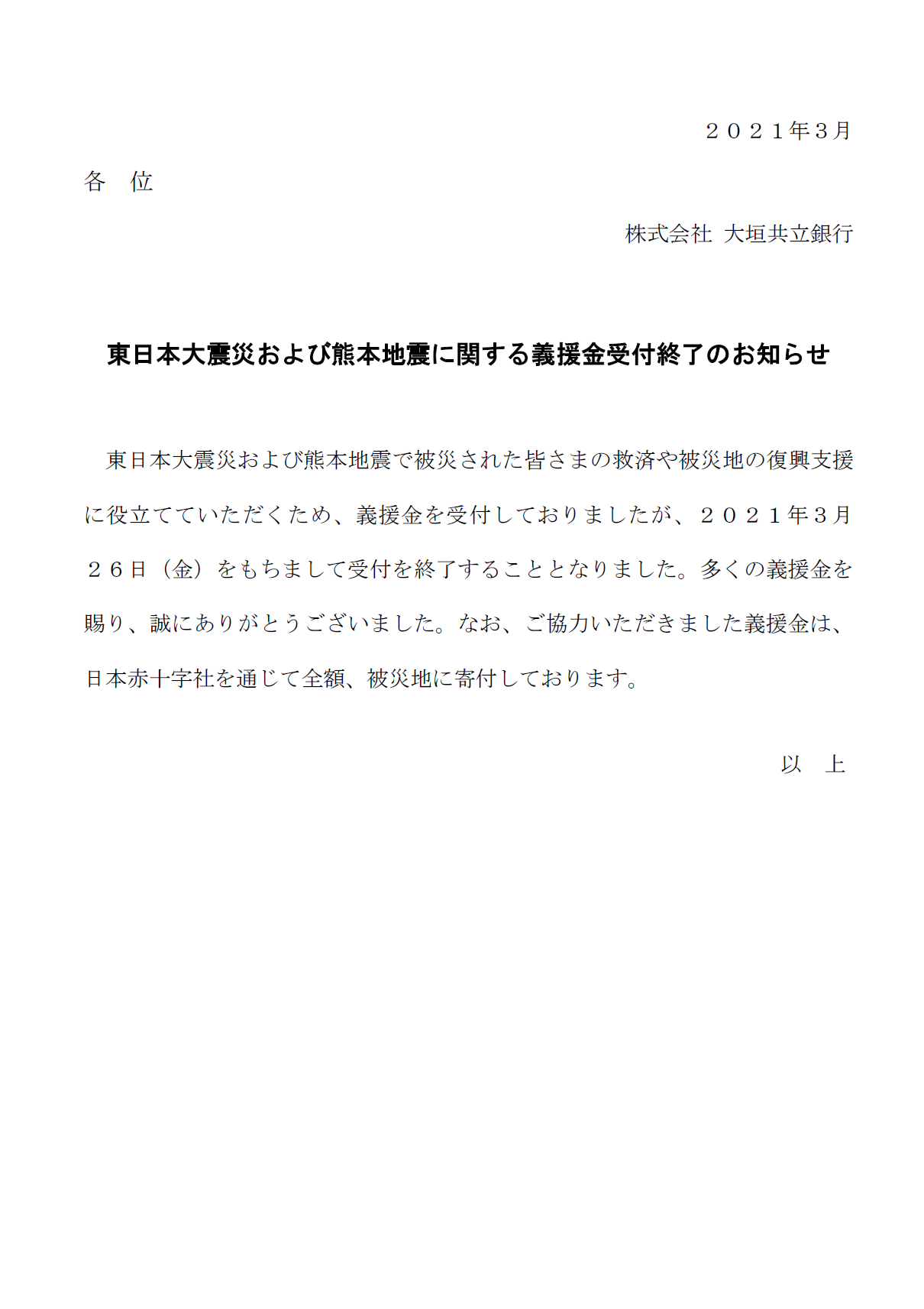 東日本大震災および熊本地震に関する義援金受付終了のお知らせ