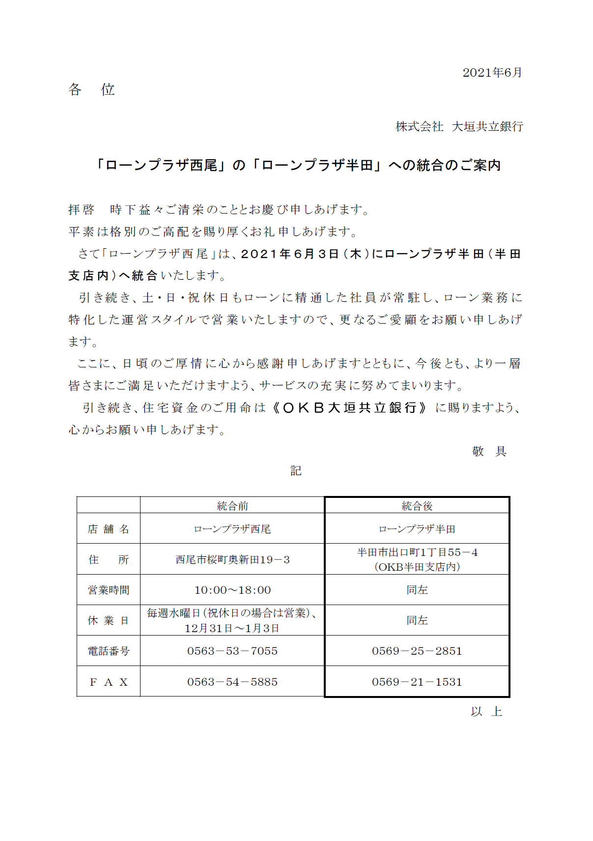 「ローンプラザ西尾」の「ローンプラザ半田」への統合のご案内