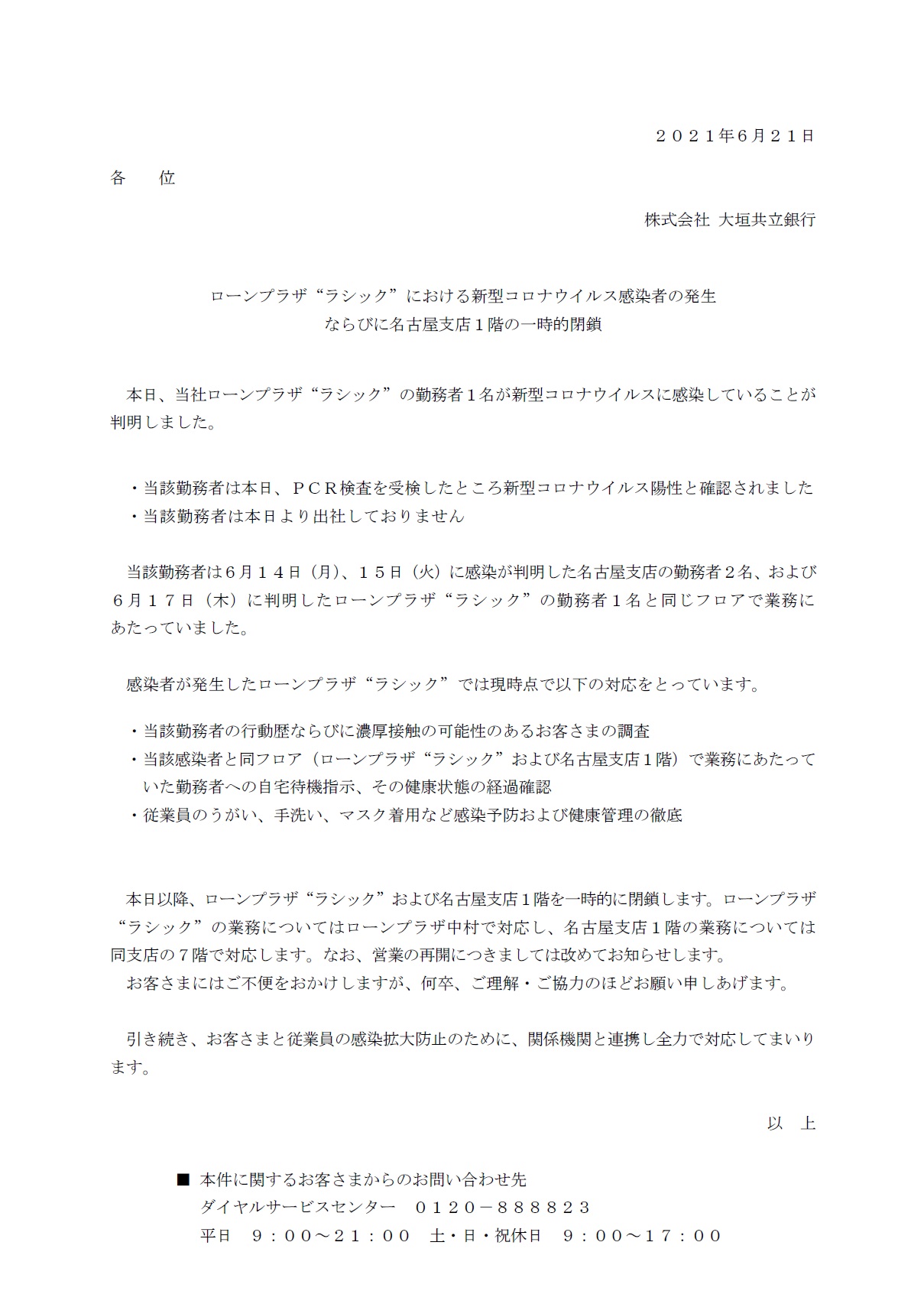 ローンプラザ“ラシック”における新型コロナウイルス感染者の発生ならびに名古屋支店1階の一時的閉鎖