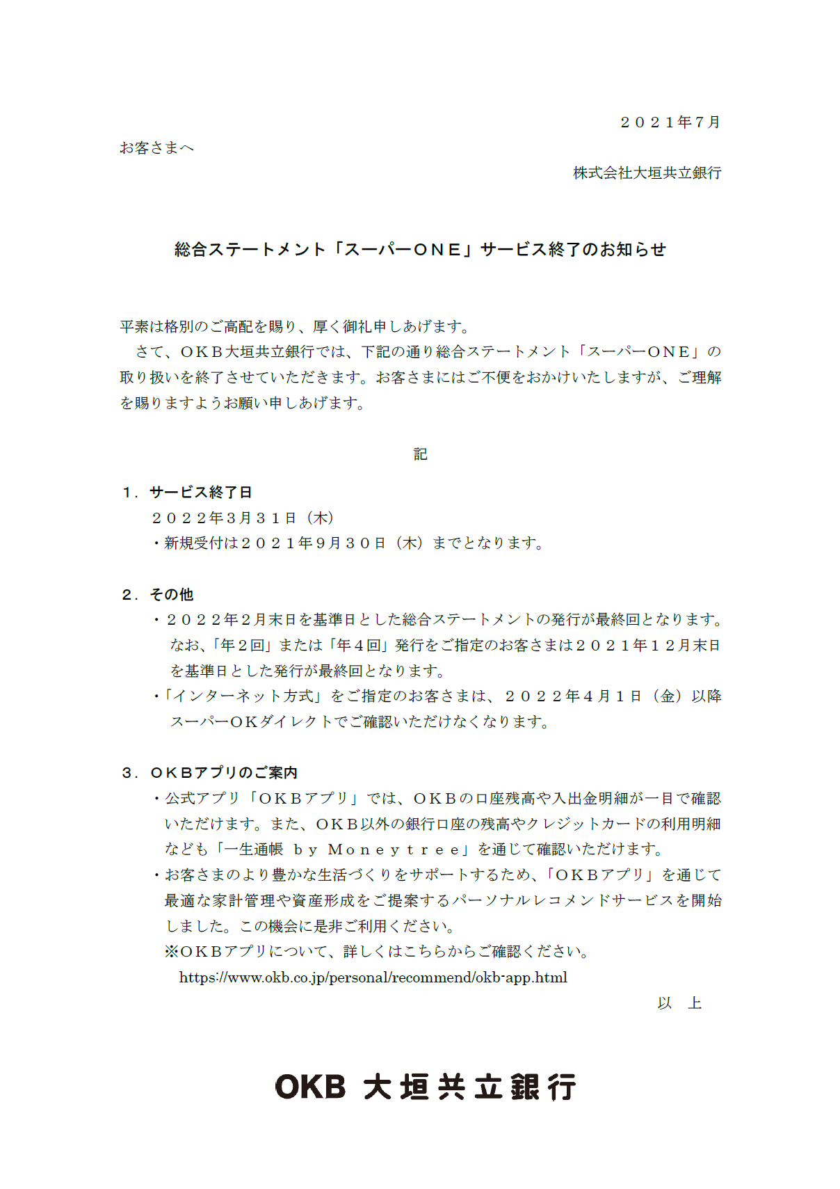 総合ステートメント「スーパーONE」サービス終了のお知らせ