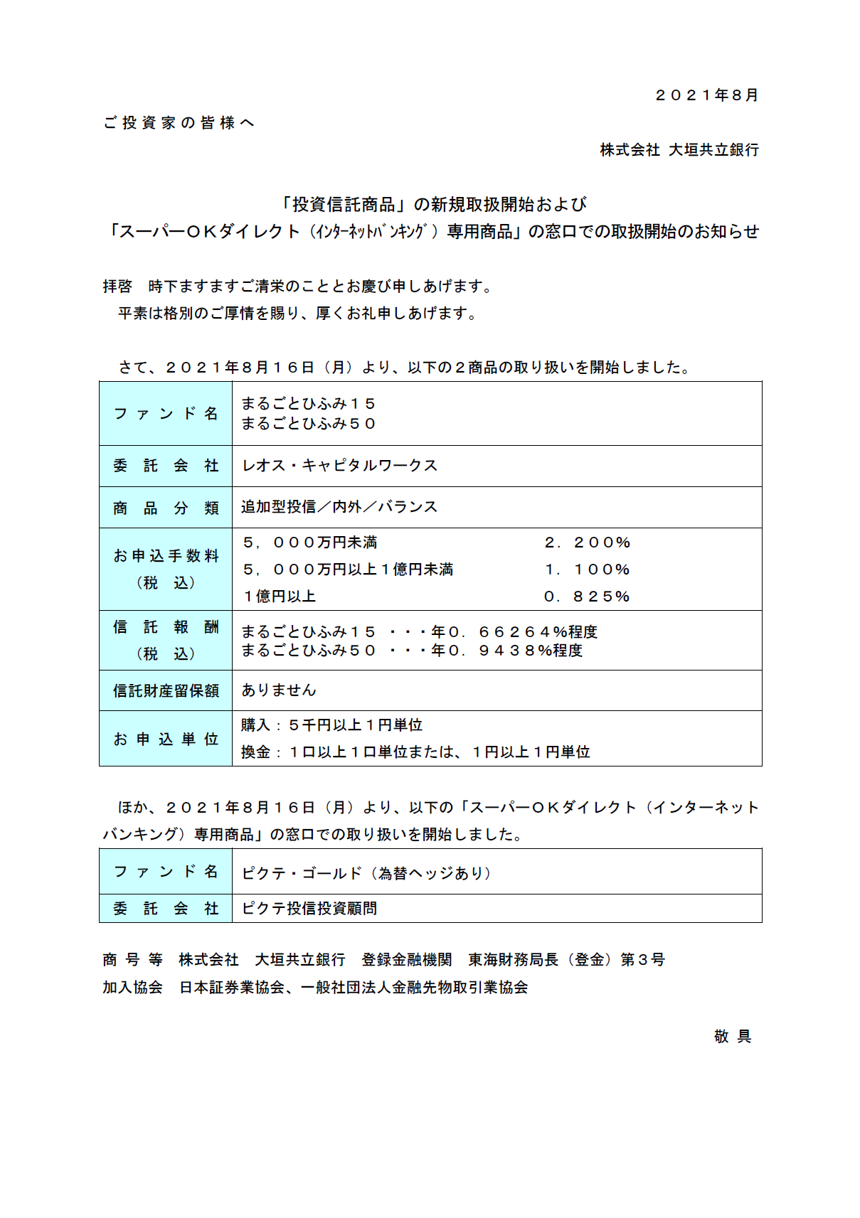 「投資信託商品」の新規取扱開始および「スーパーOKダイレクト(インターネットバンキング)専用商品」の窓口での取扱開始のお知らせ