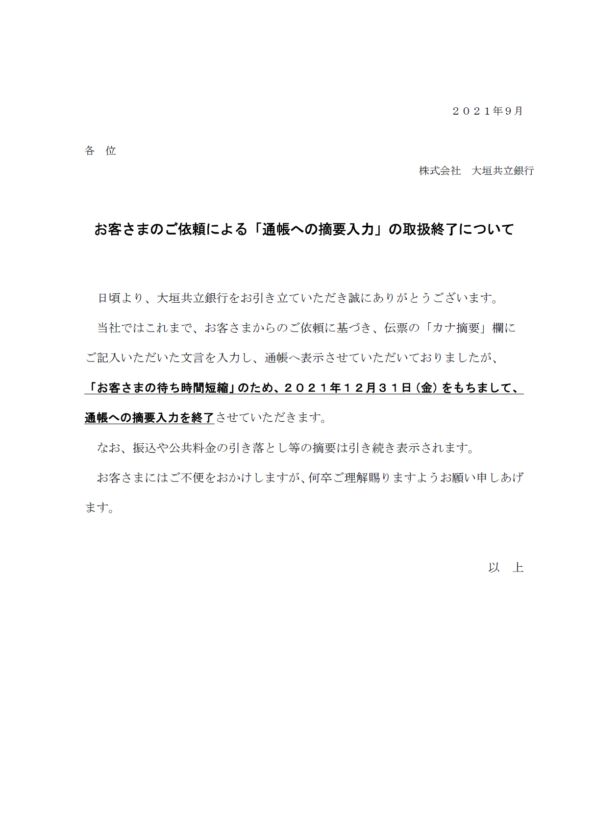 お客さまのご依頼による「通帳への摘要入力」取扱終了ついて