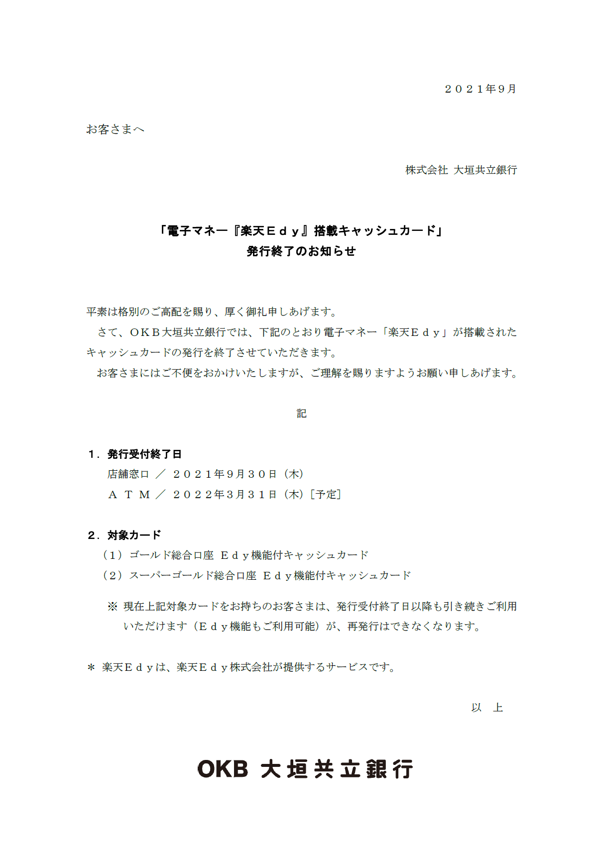 「電子マネー『楽天Edy』搭載キャッシュカード」発行終了のお知らせ