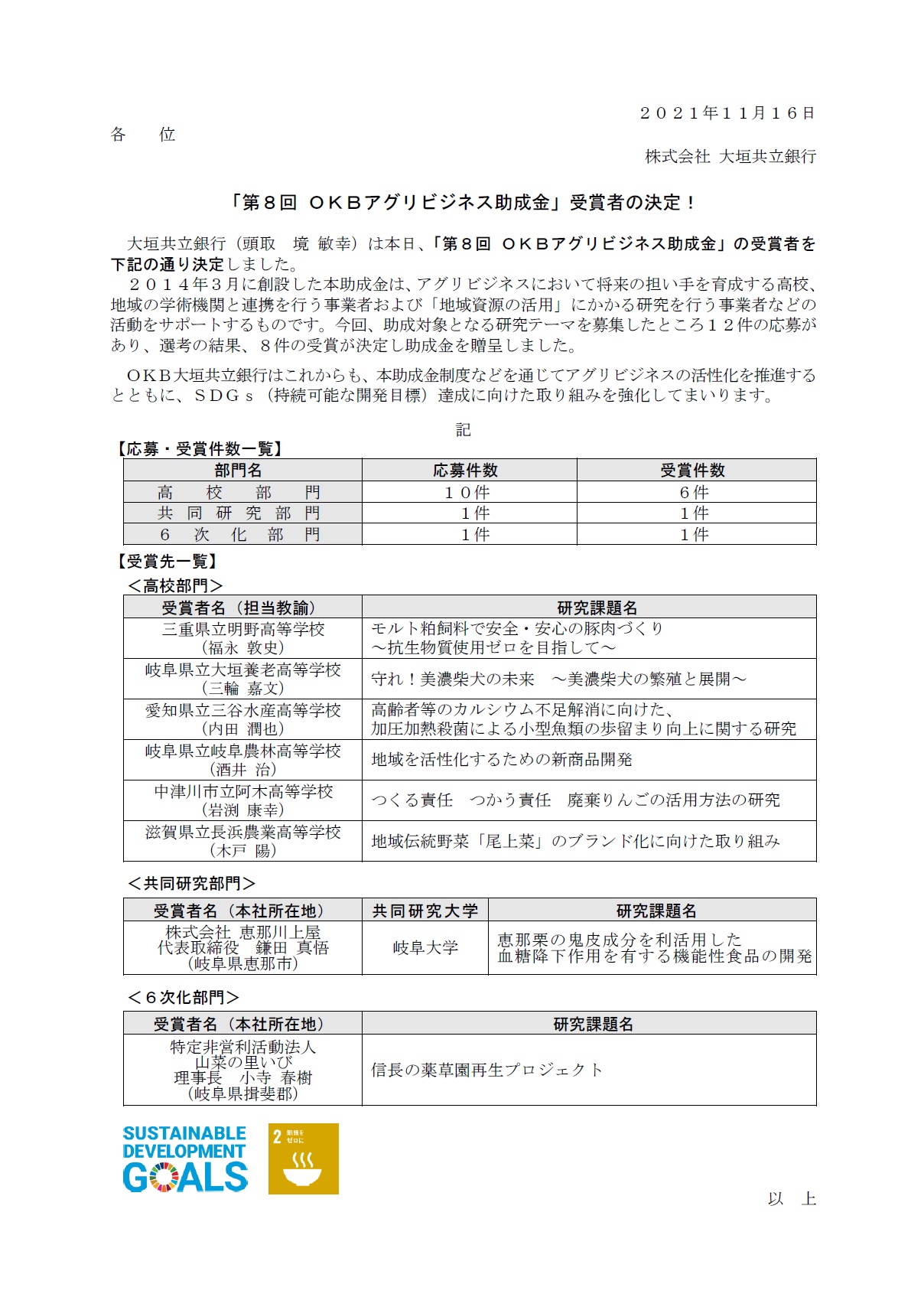 「第8回 OKBアグリビジネス助成金」受賞者の決定!