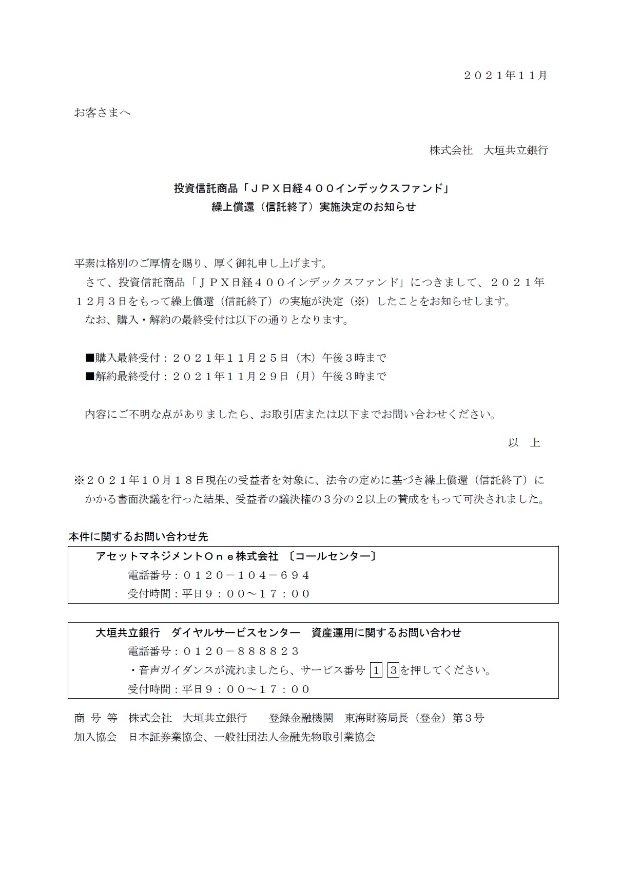投資信託商品「JPX日経400インデックスファンド」繰上償還(信託終了)実施決定のお知らせ