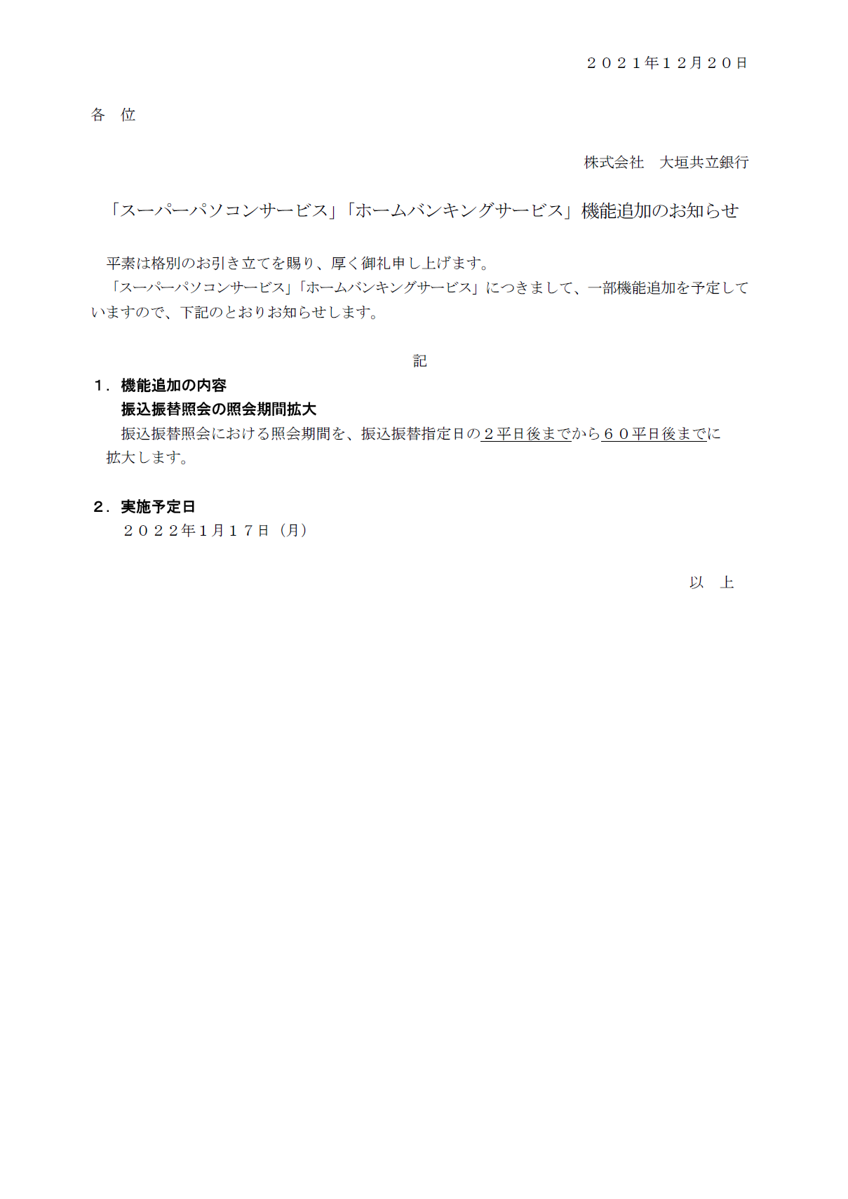 「スーパーパソコンサービス」「ホームバンキングサービス」機能追加のお知らせ