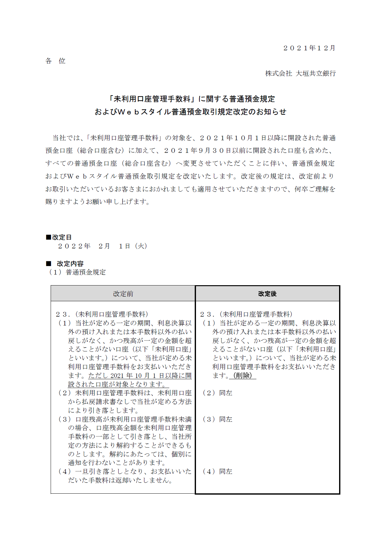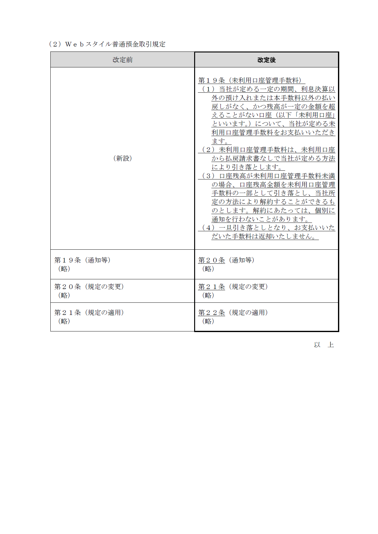 「未利用口座管理手数料」に関する普通預金規定およびWebスタイル普通預金取引規定改定のお知らせ