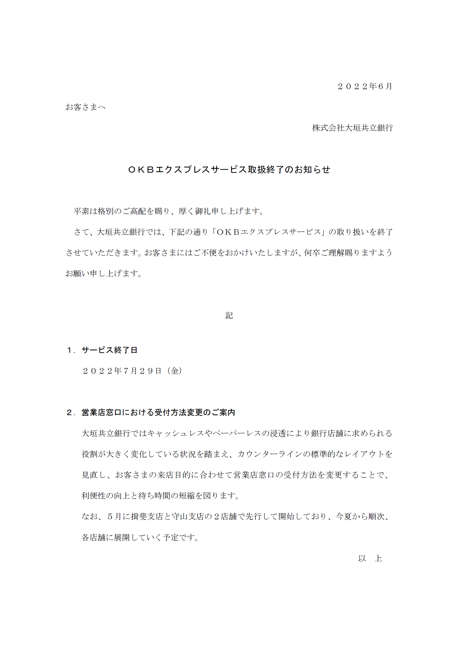 OKBエクスプレスサービス取扱終了のお知らせ