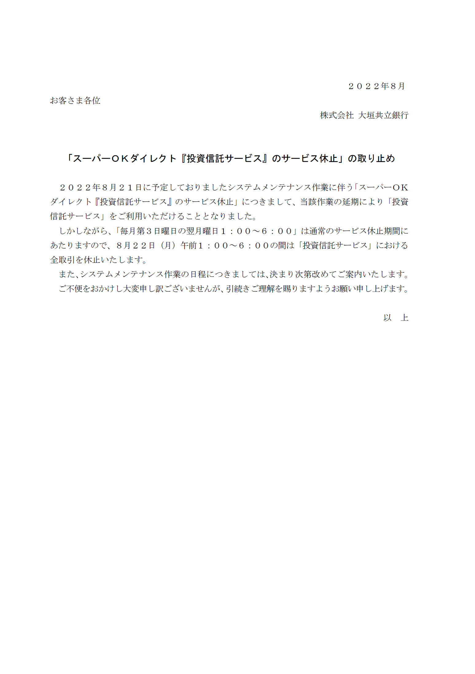 「スーパーOKダイレクト『投資信託サービス』のサービス休止」の取り止め