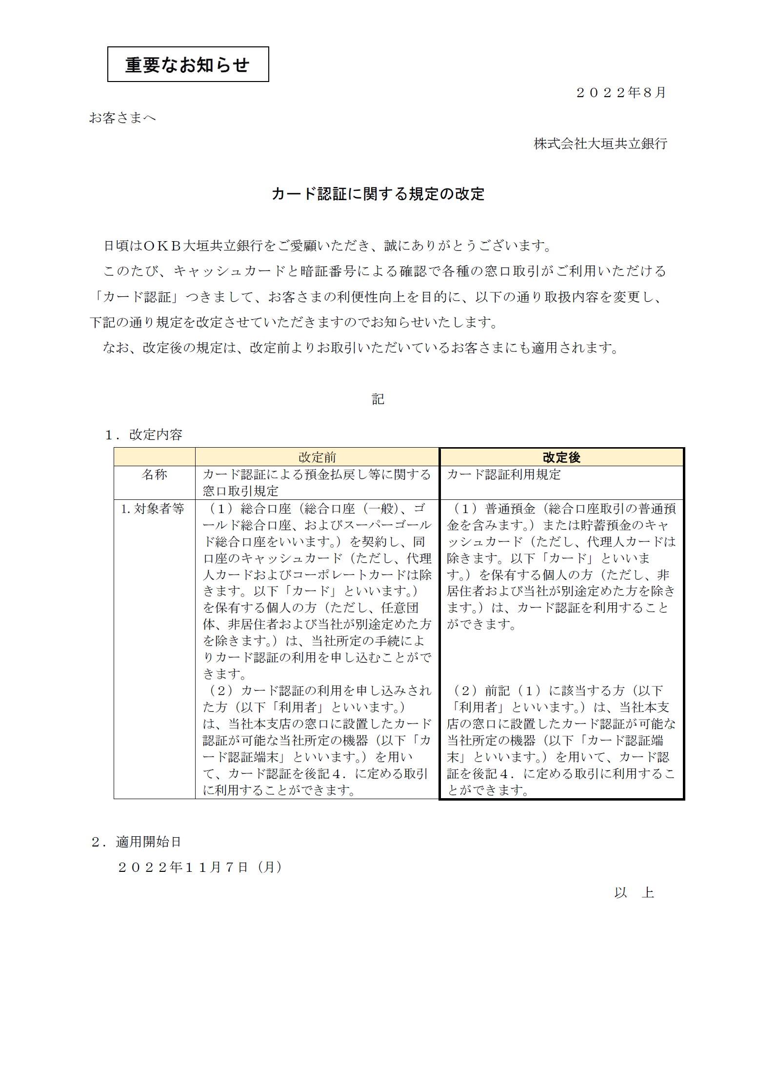 カード認証に関する規定の改定