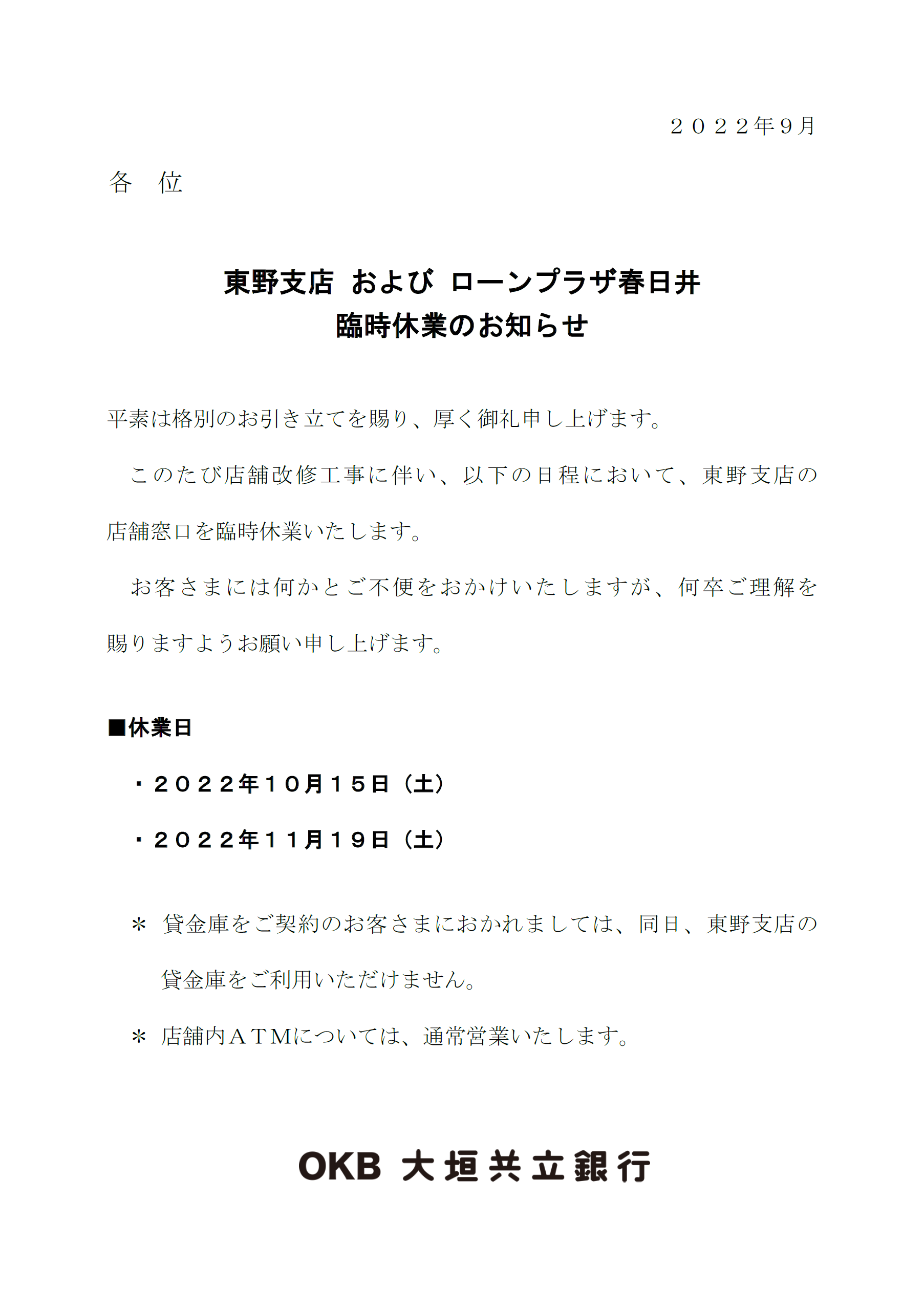 東野支店 および ローンプラザ春日井 臨時休業のお知らせ