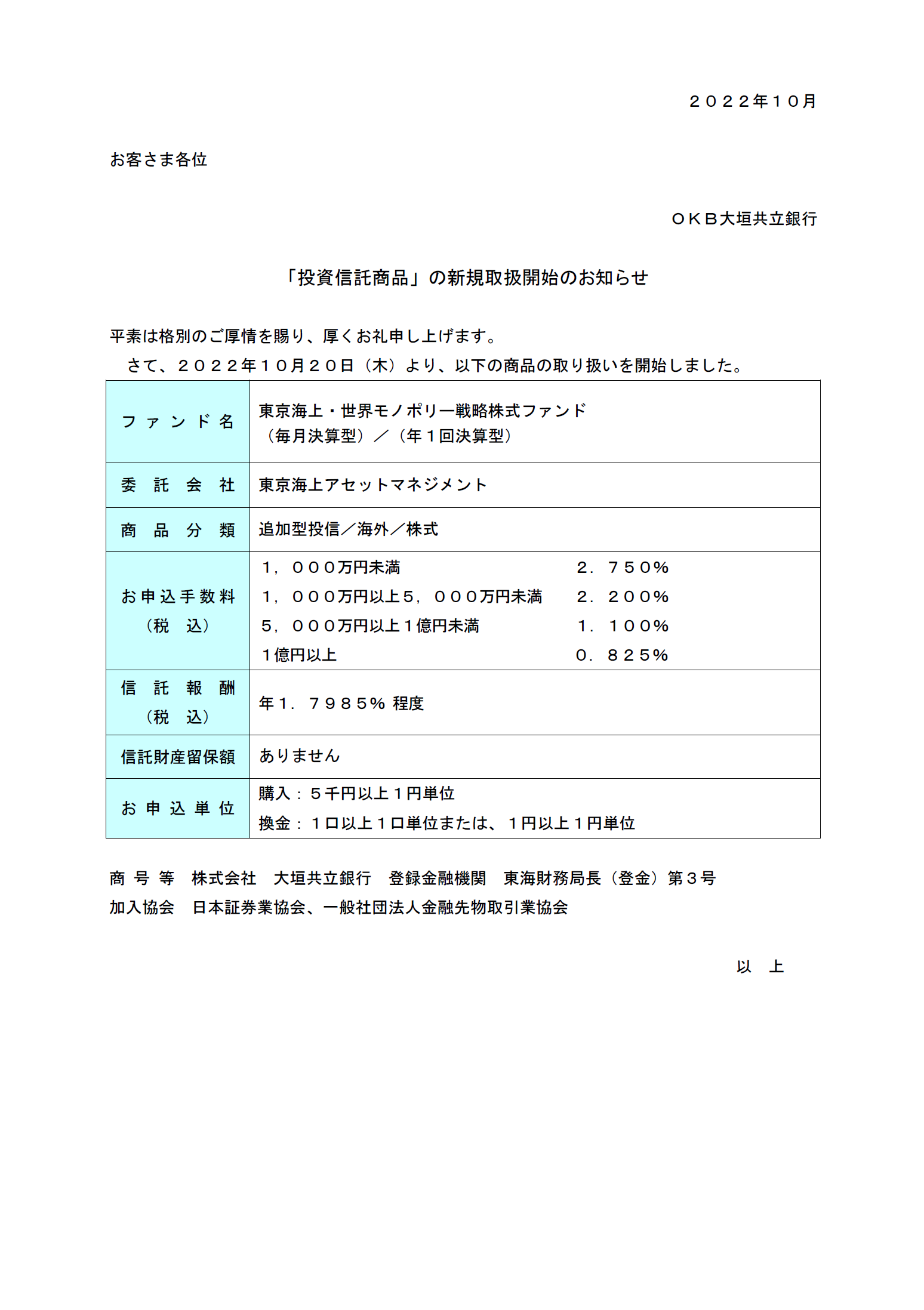 「投資信託商品」の新規取扱開始のお知らせ