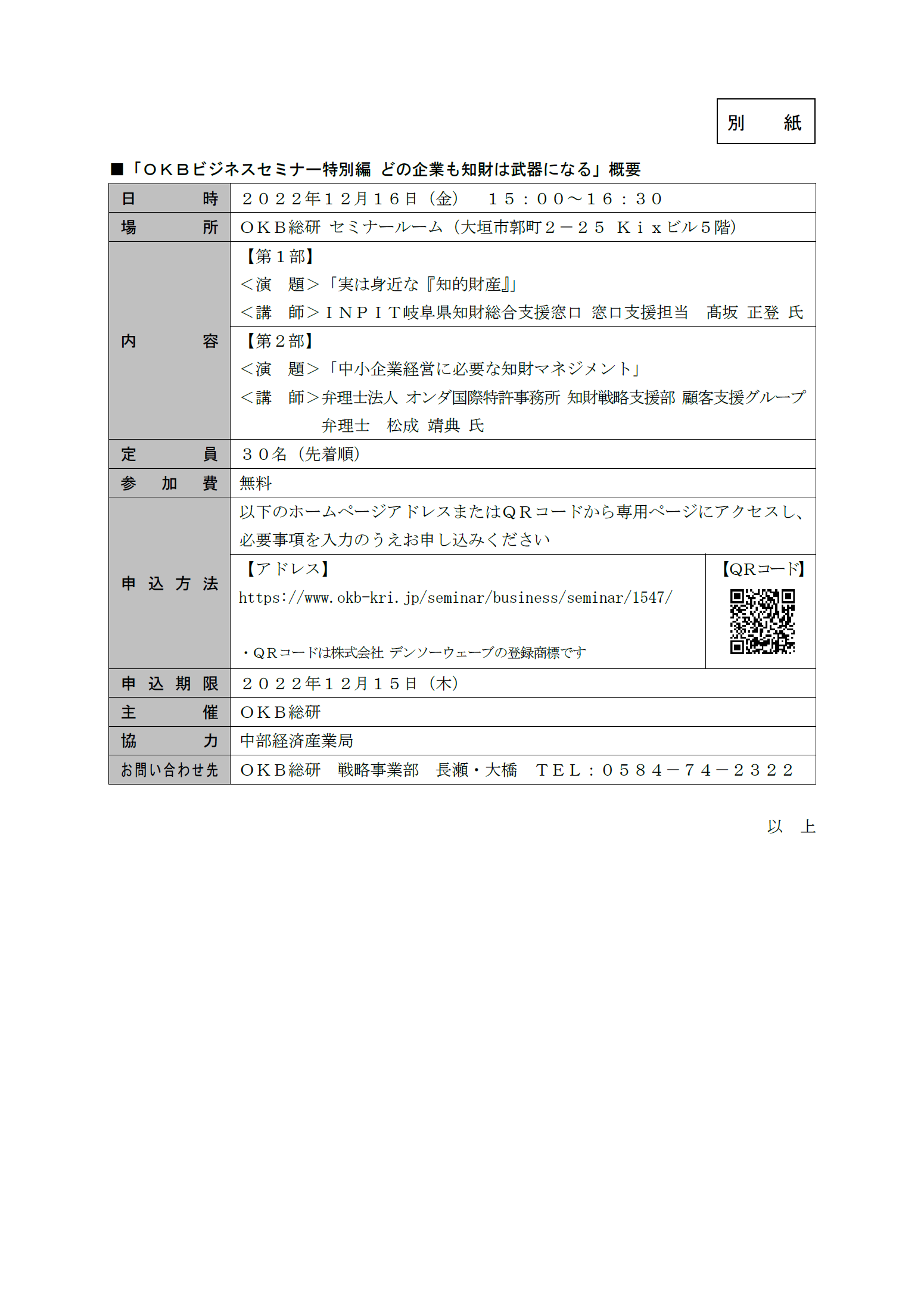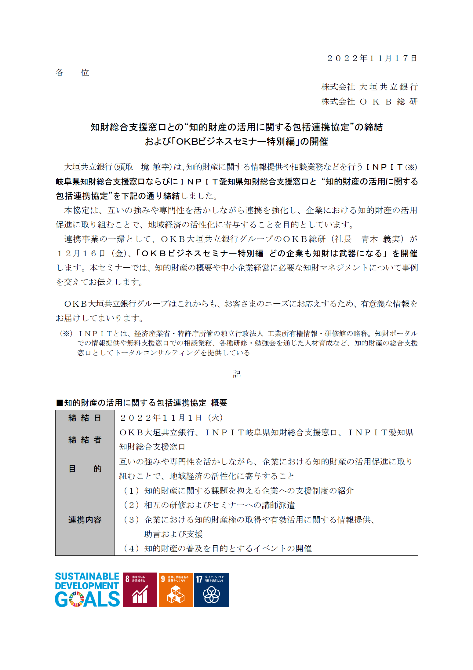 知財総合支援窓口との“知的財産の活用に関する包括連携協定”の締結および「OKBビジネスセミナー特別編」の開催