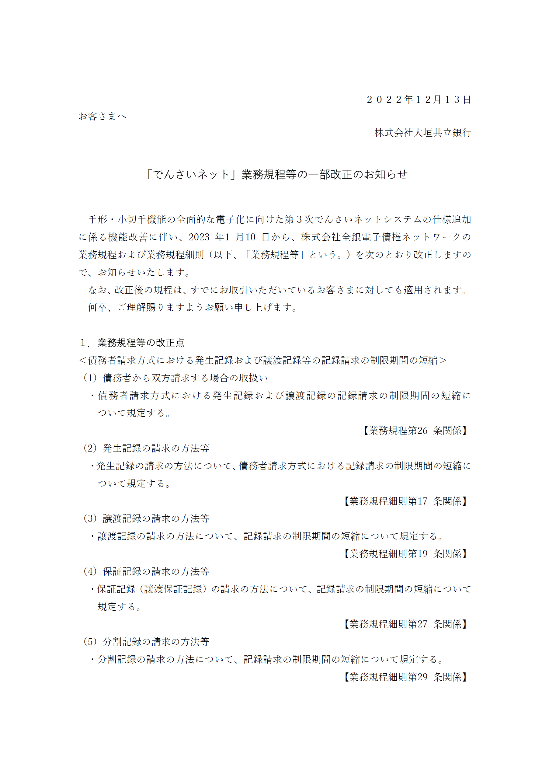 「でんさいネット」業務規程等の一部改正のお知らせ