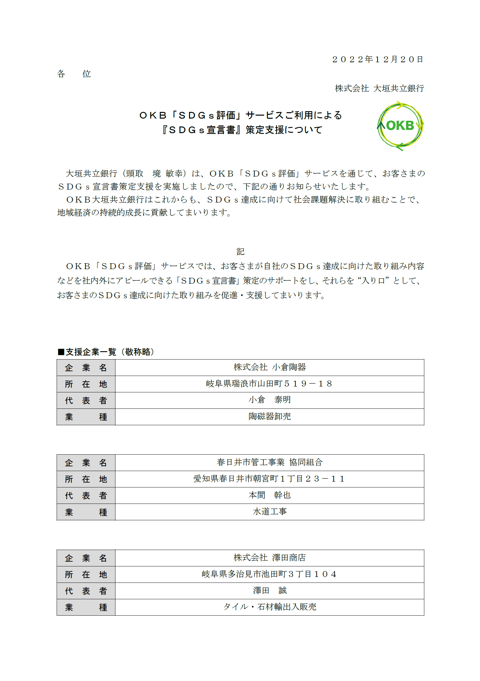 OKB「SDGs評価 」 サービス ご利用による『SDGs宣言書』策定支援について