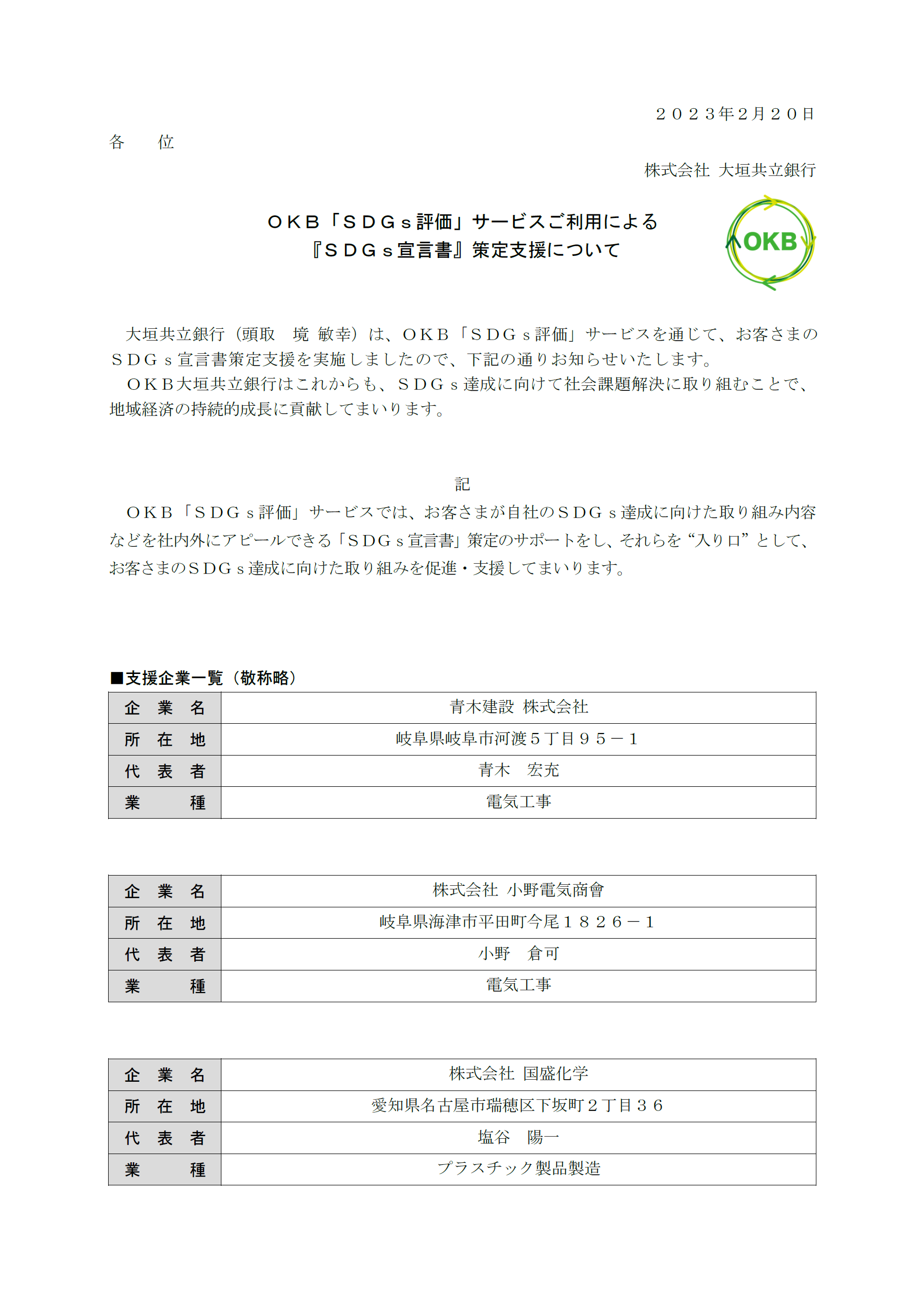OKB「SDGs評価」サービスご利用による 『SDGs宣言書』策定支援について