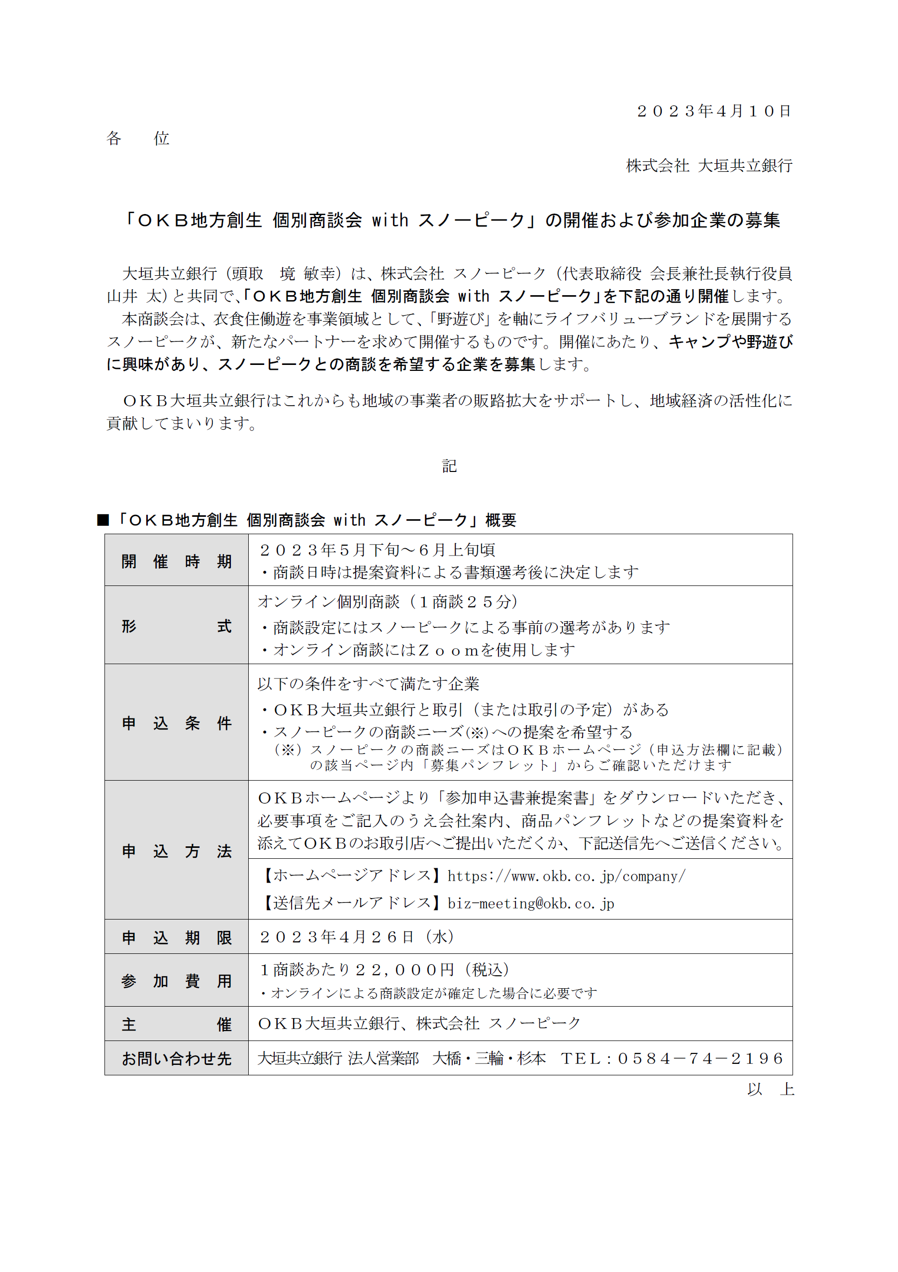 「OKB地方創生 個別商談会 with スノーピーク」の開催および参加企業の募集