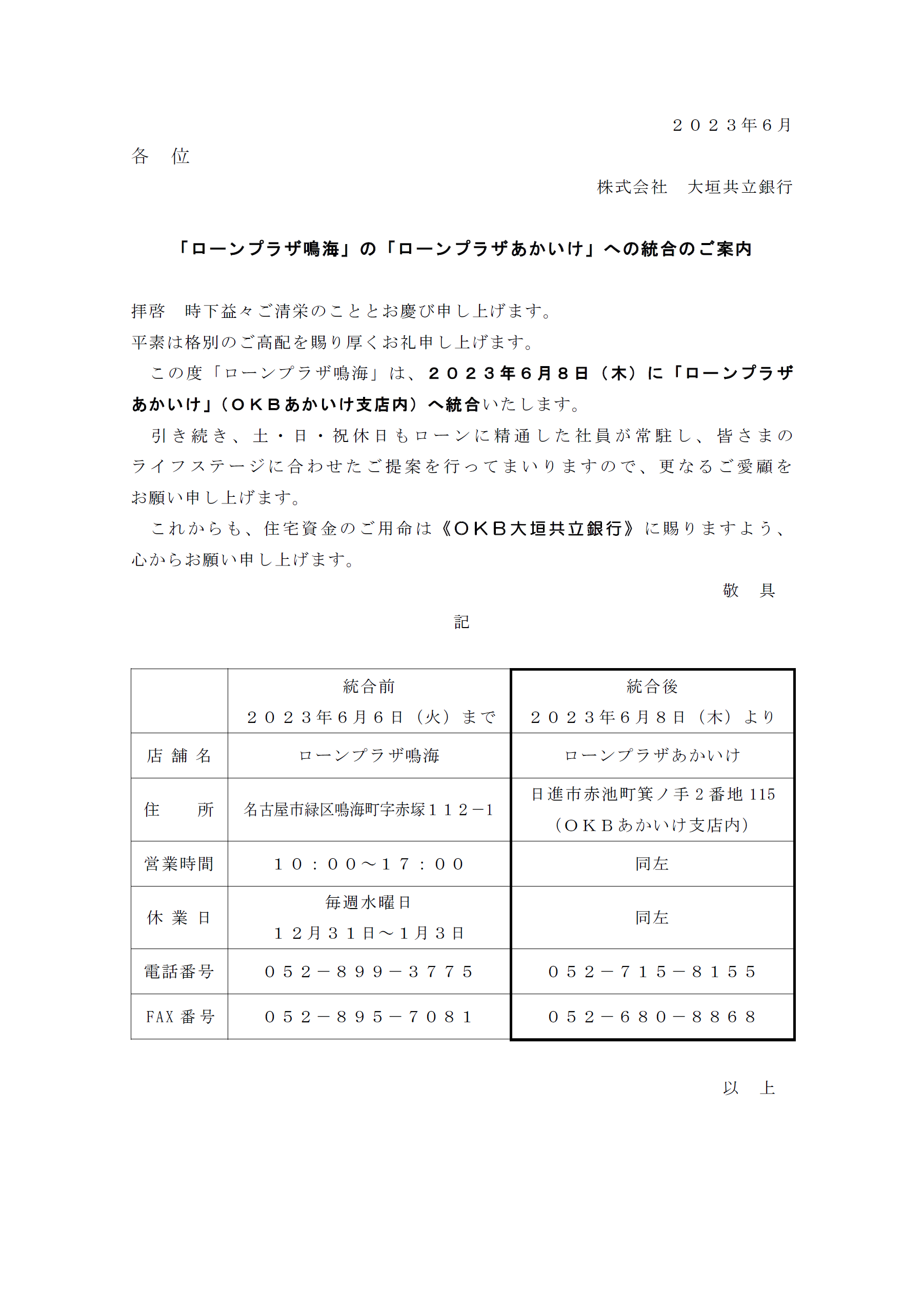「ローンプラザ鳴海」の「ローンプラザあかいけ」への統合のご案内