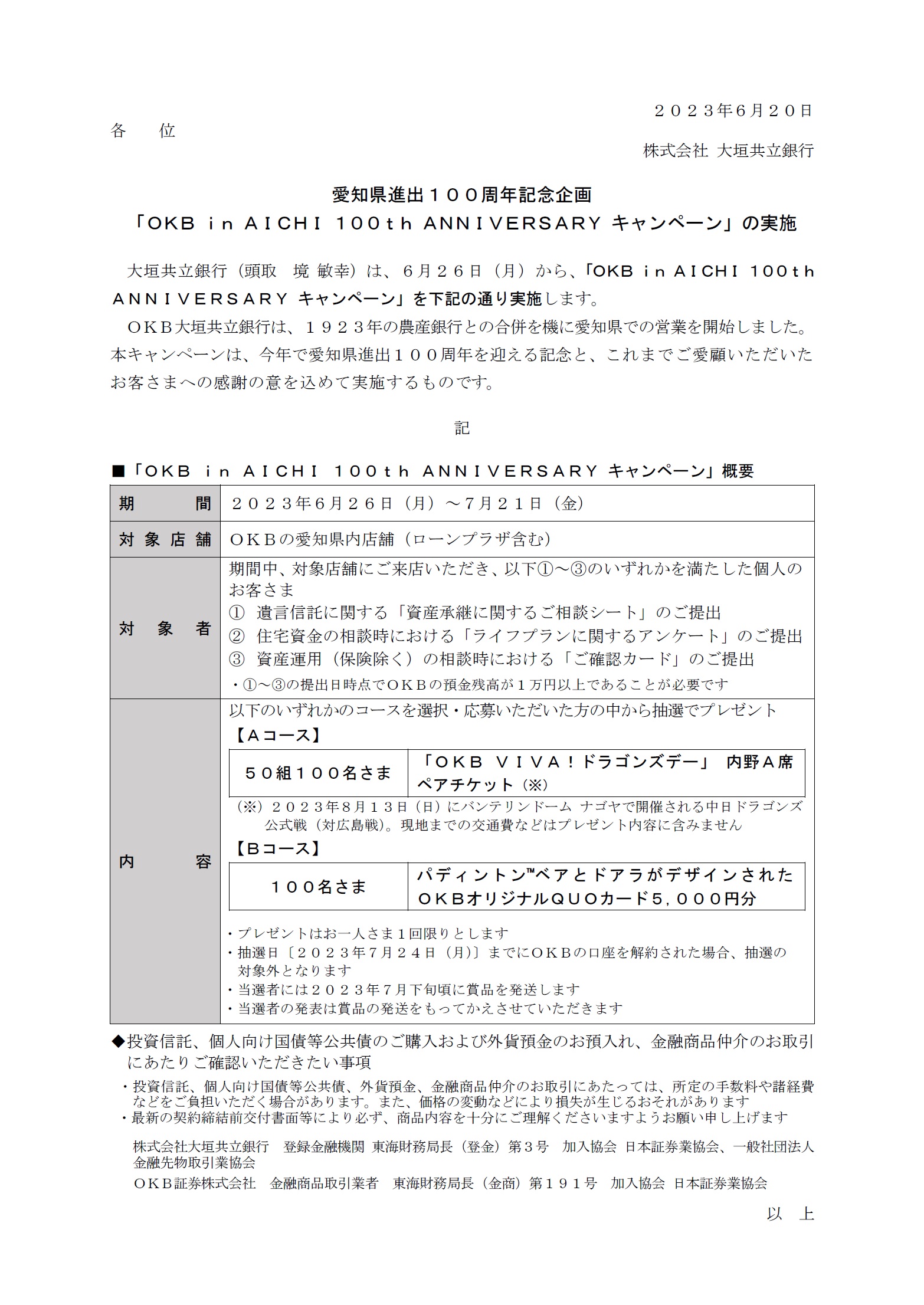愛知県進出100周年記念企画 「 OKB in AICHI 100th ANNIVERSARY キャンペーン 」 の実施