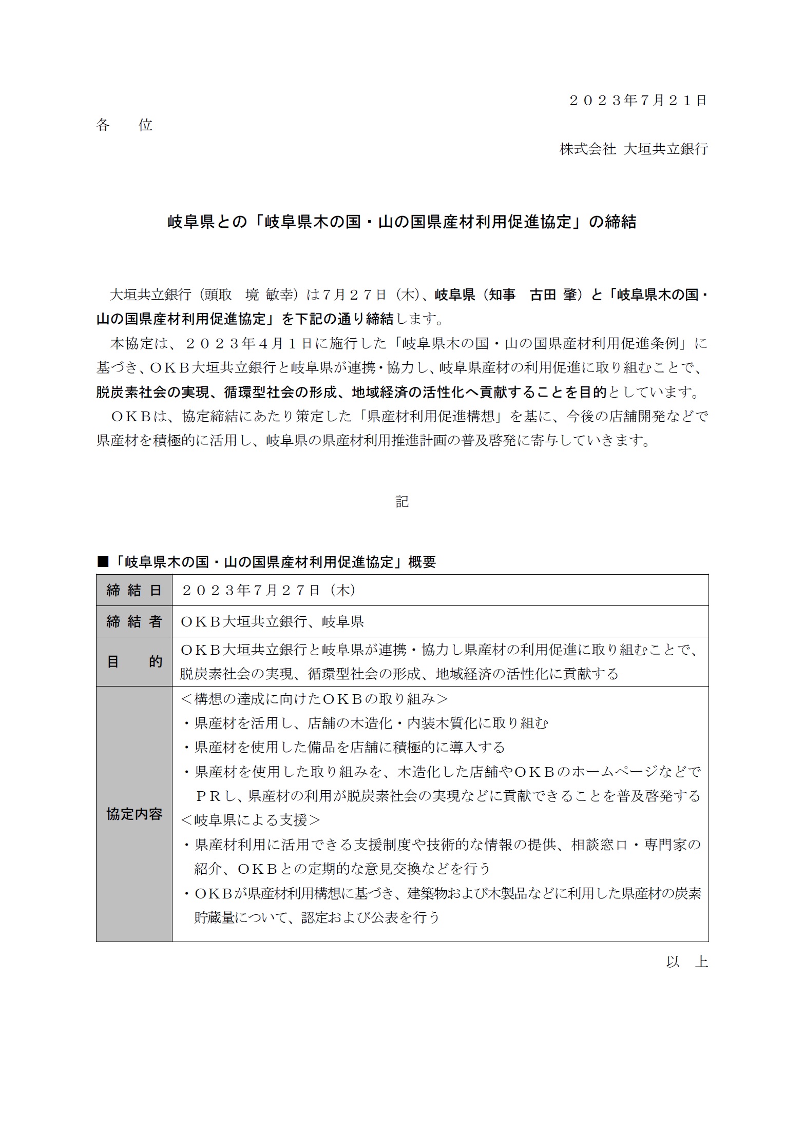 岐阜県との「岐阜県木の国・山の国県産材利用促進協定」の締結