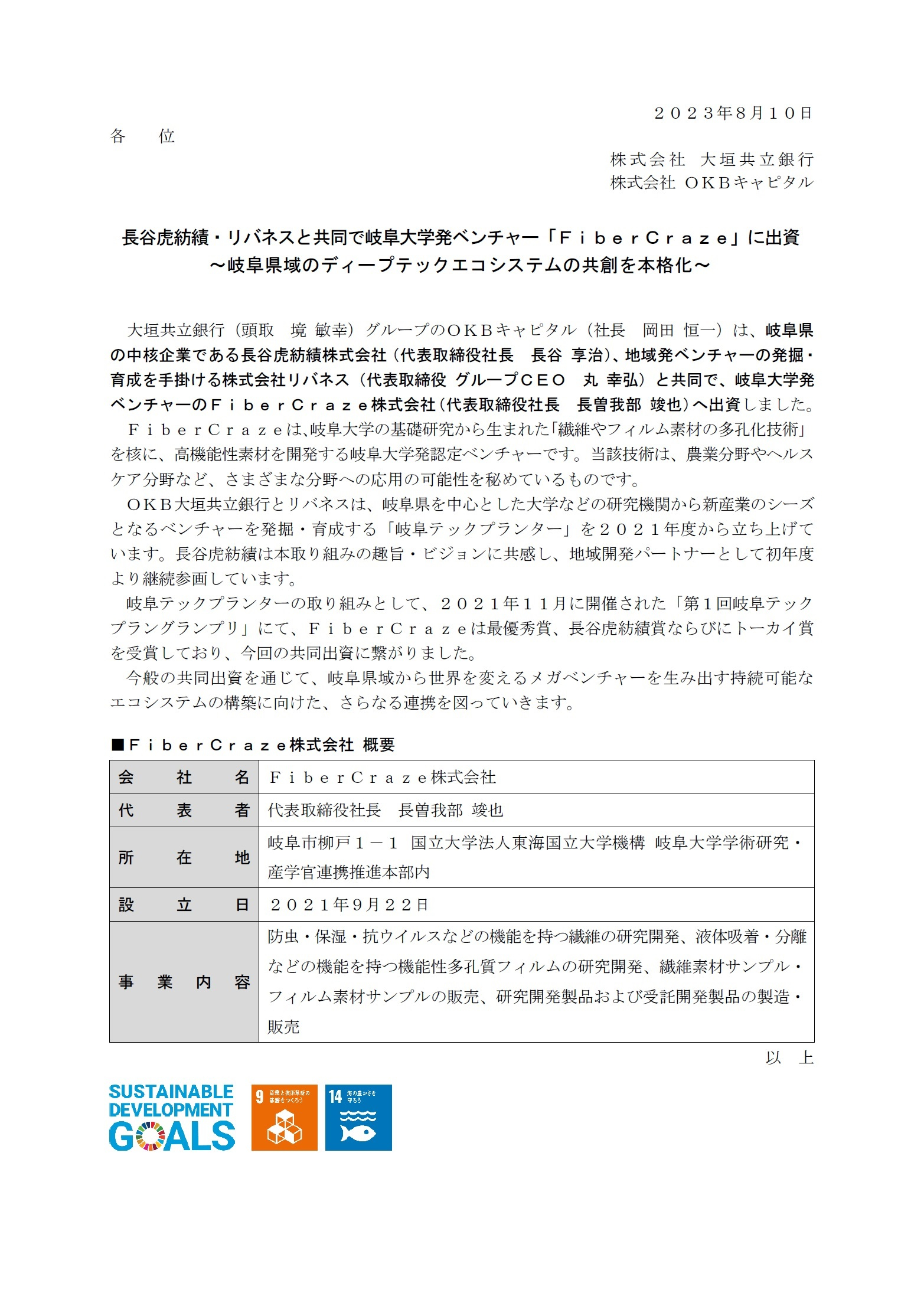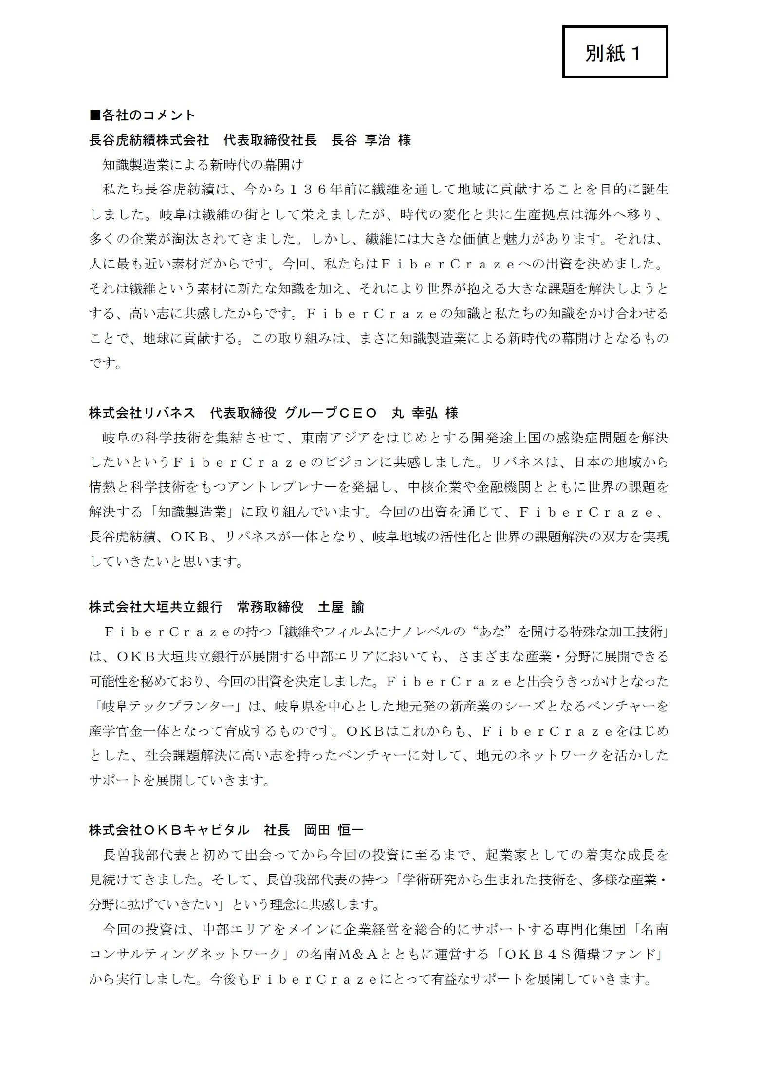 長谷虎紡績・リバネスと共同で岐阜大学発ベンチャー「FiberCraze」に出資