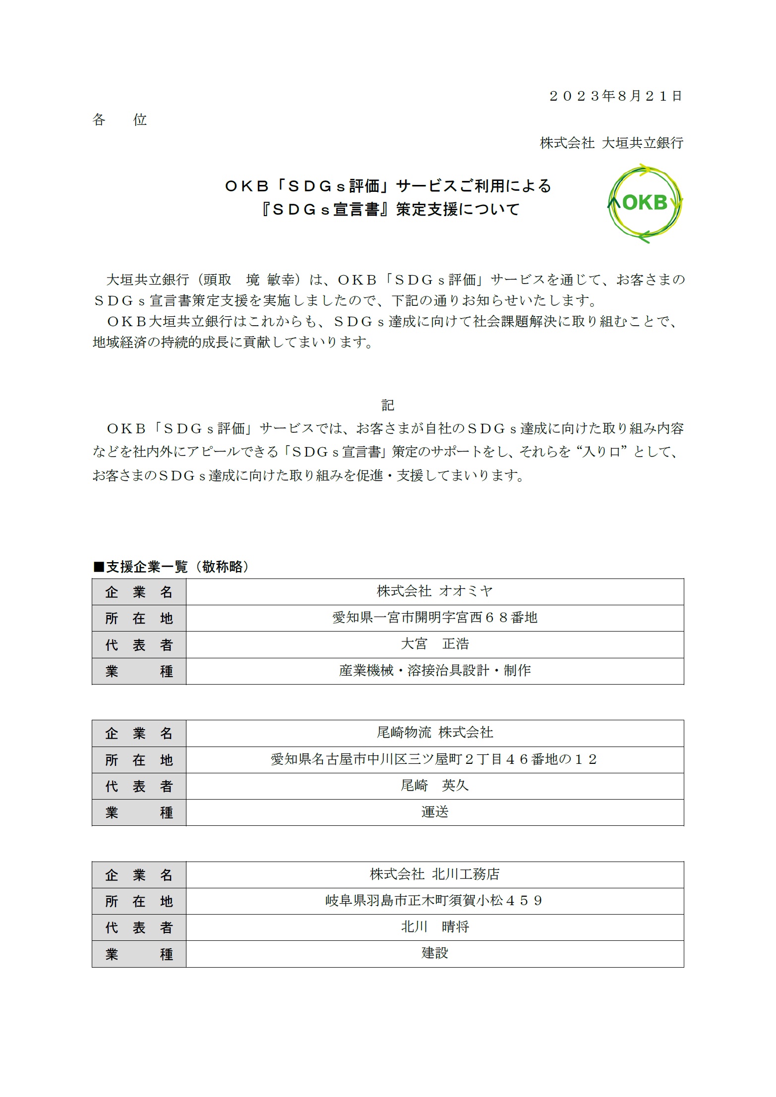 OKB「SDGs評価 」サービスご利用による『SDGs宣言書』策定支援について