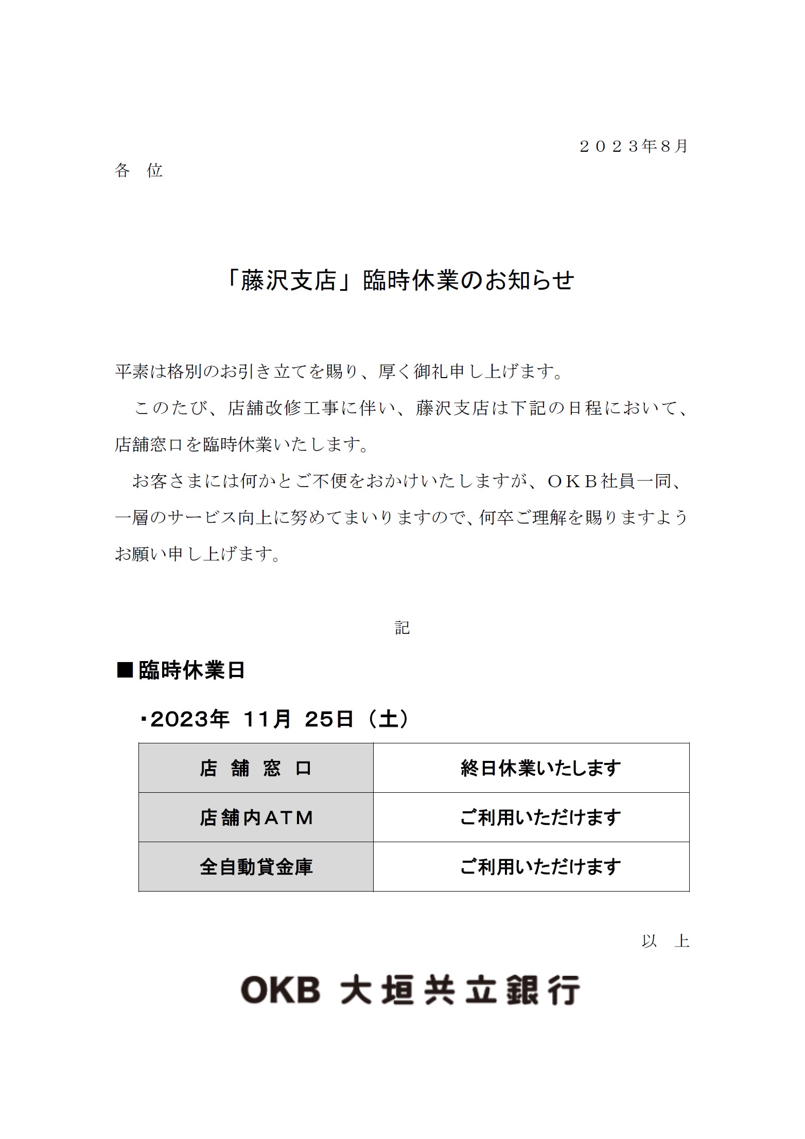 「藤沢支店」臨時休業のお知らせ