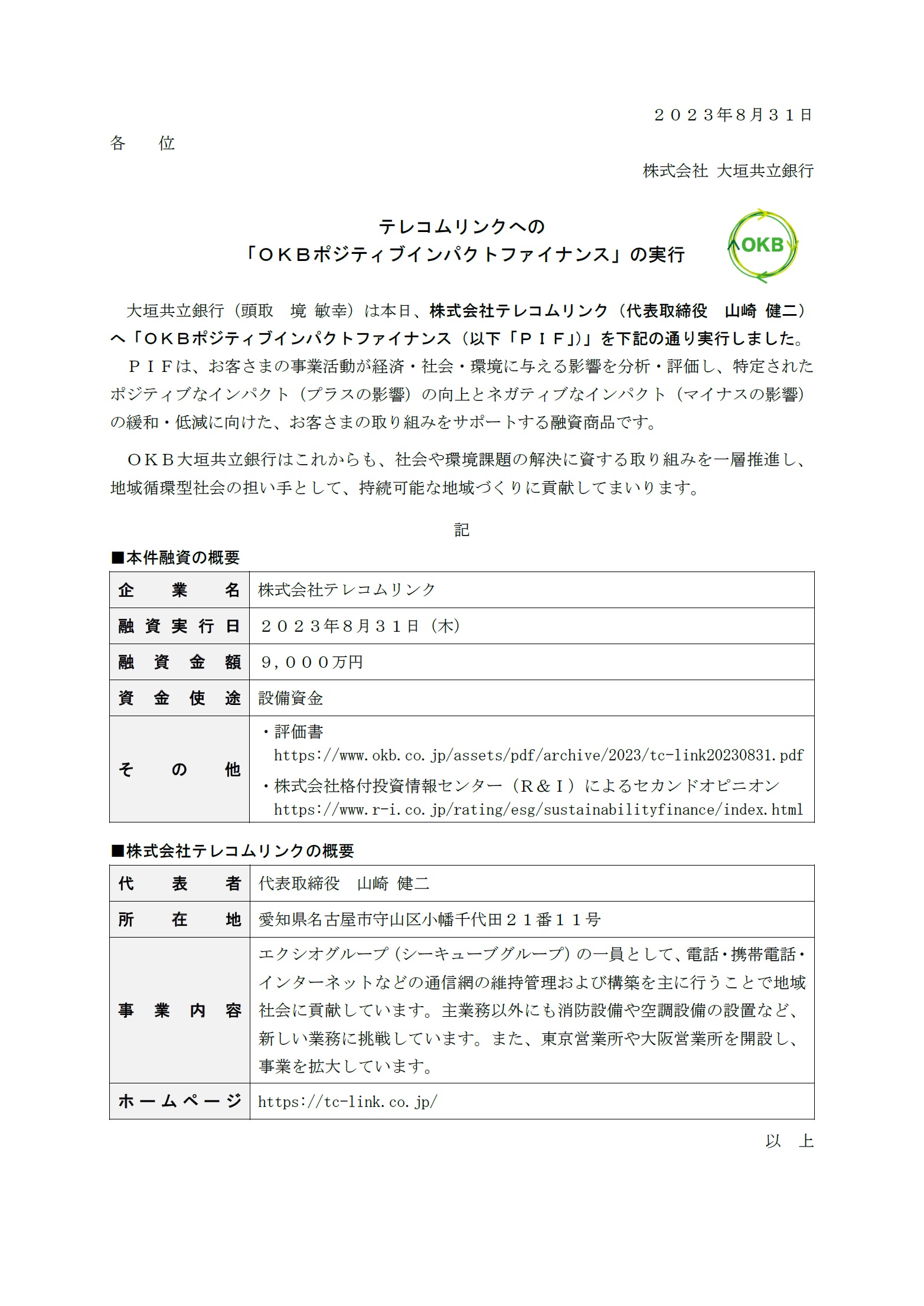 テレコムリンクへの 「OKBポジティブインパクトファイナンス」の実行