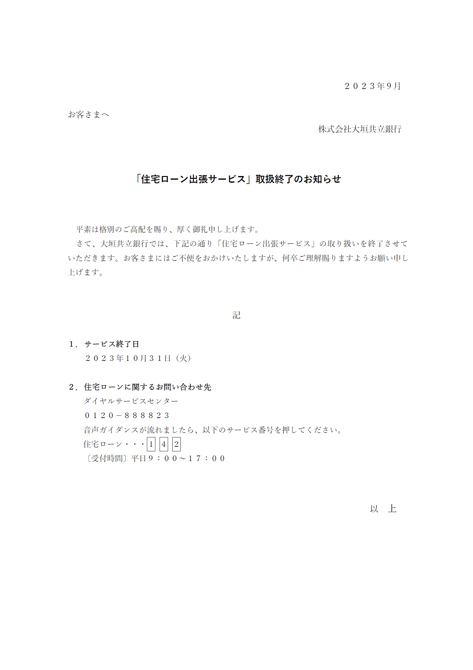 「住宅ローン出張サービス」取扱終了のお知らせ
